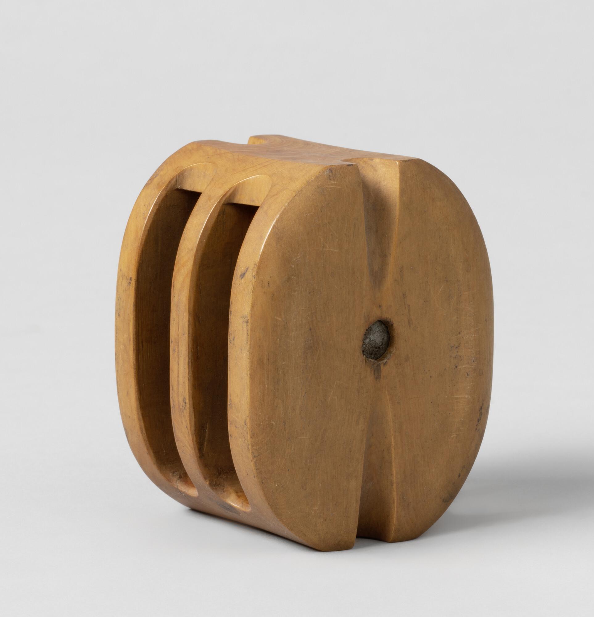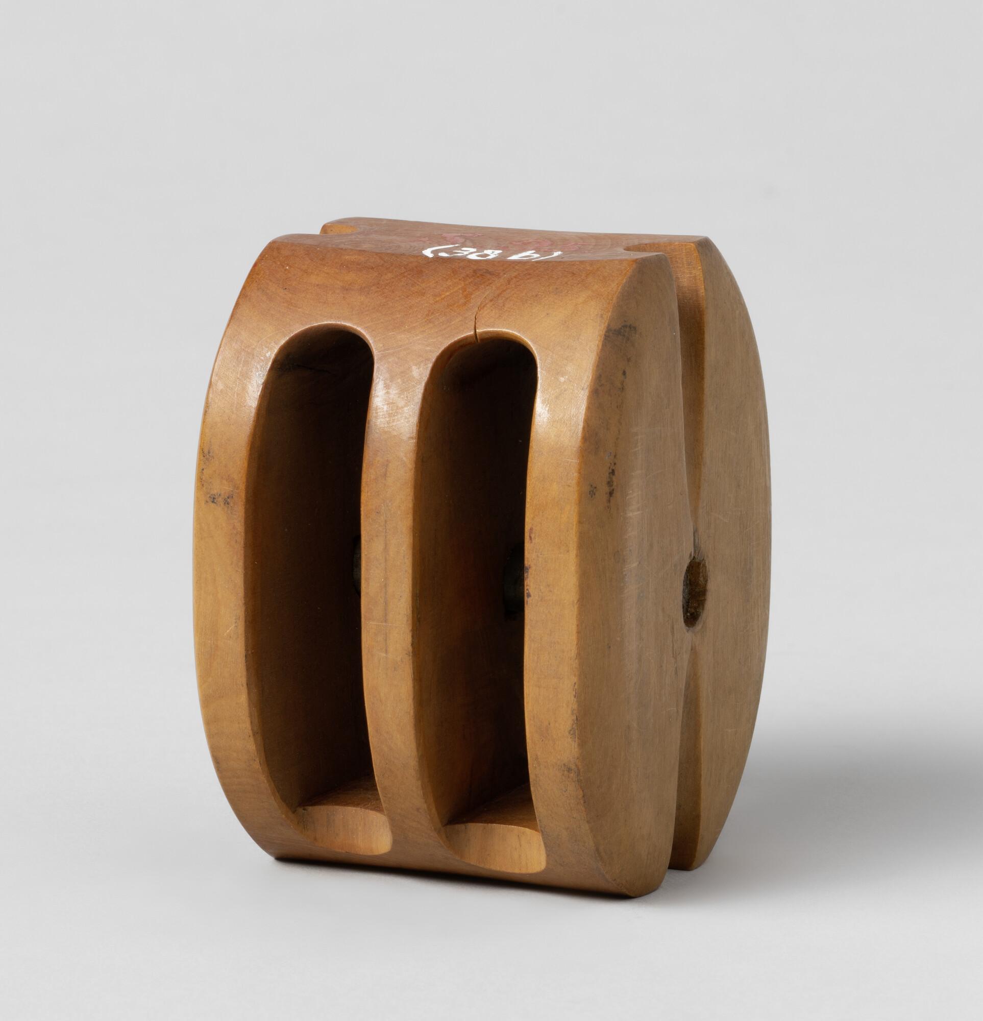 Blok, vruchtboomhout, twee bronzen schijven ontbreken, wel is de ijzeren nagel aanwezig.