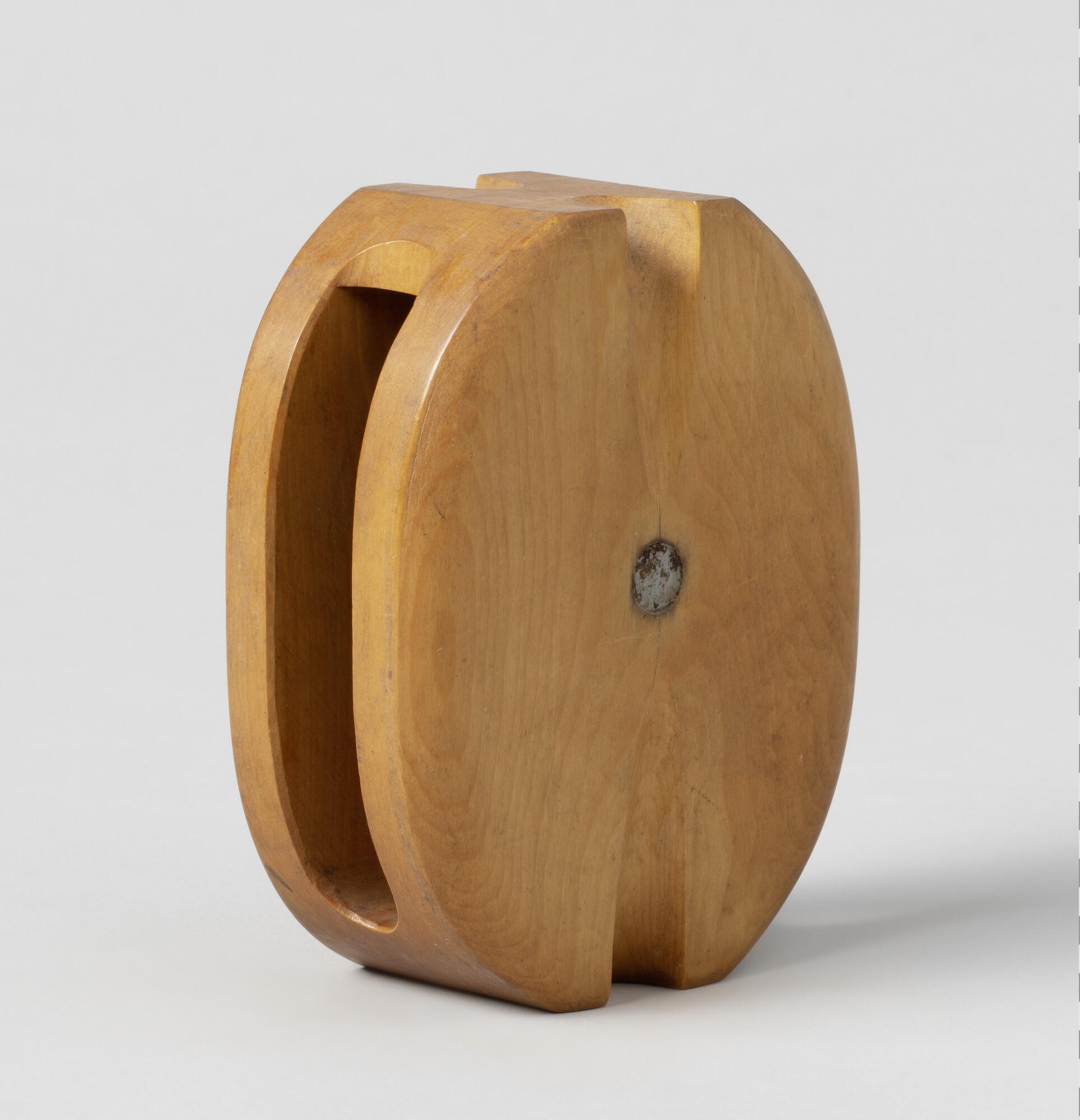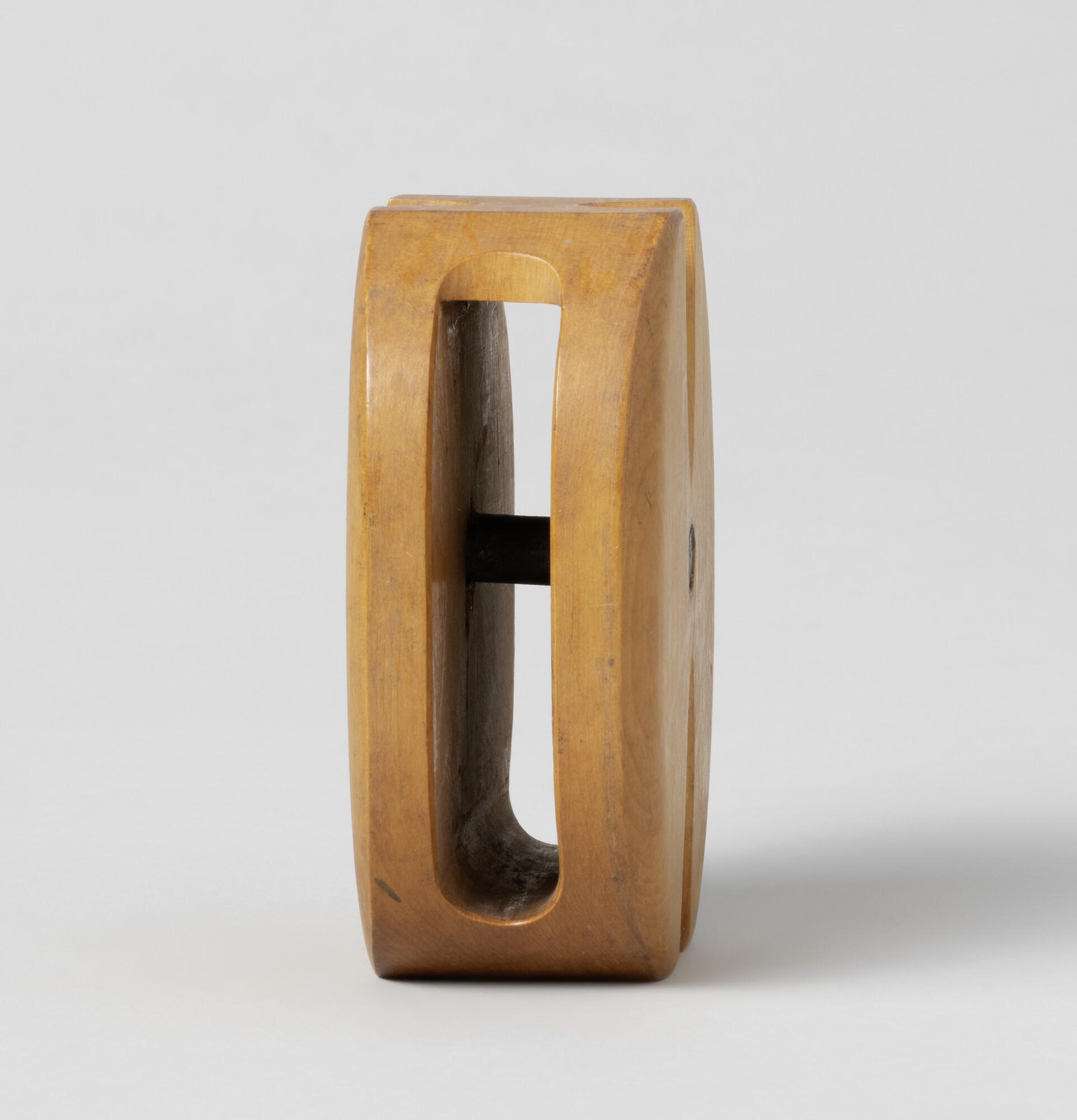Enkelschijfsblok, vruchtboomhout, één bronzen schijf ontbreekt, wel is de ijzeren nagel aanwezig.