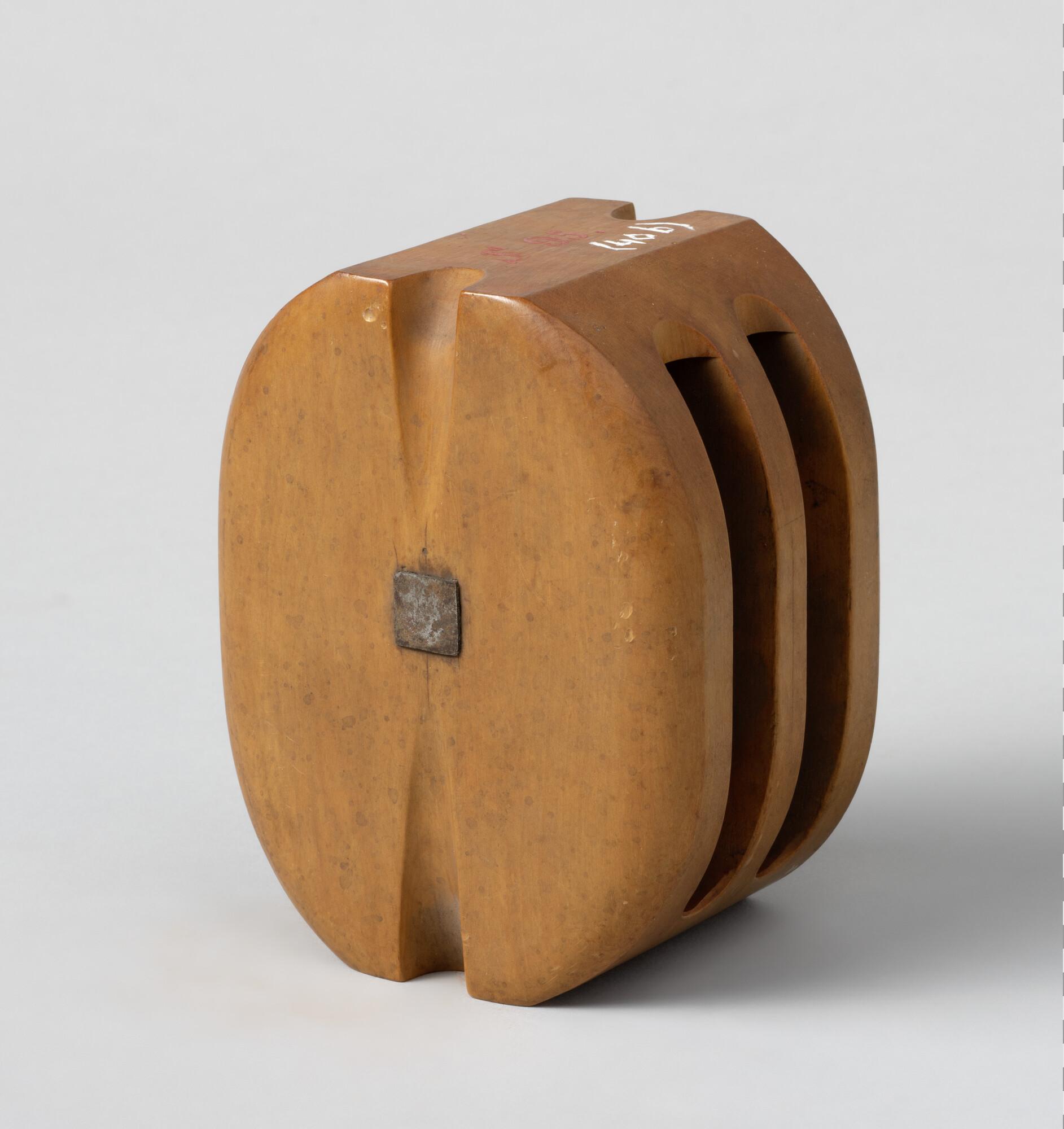 Blok, vruchtboomhout, met twee bronzen schijven en ijzeren nagel. Enkel geneut.