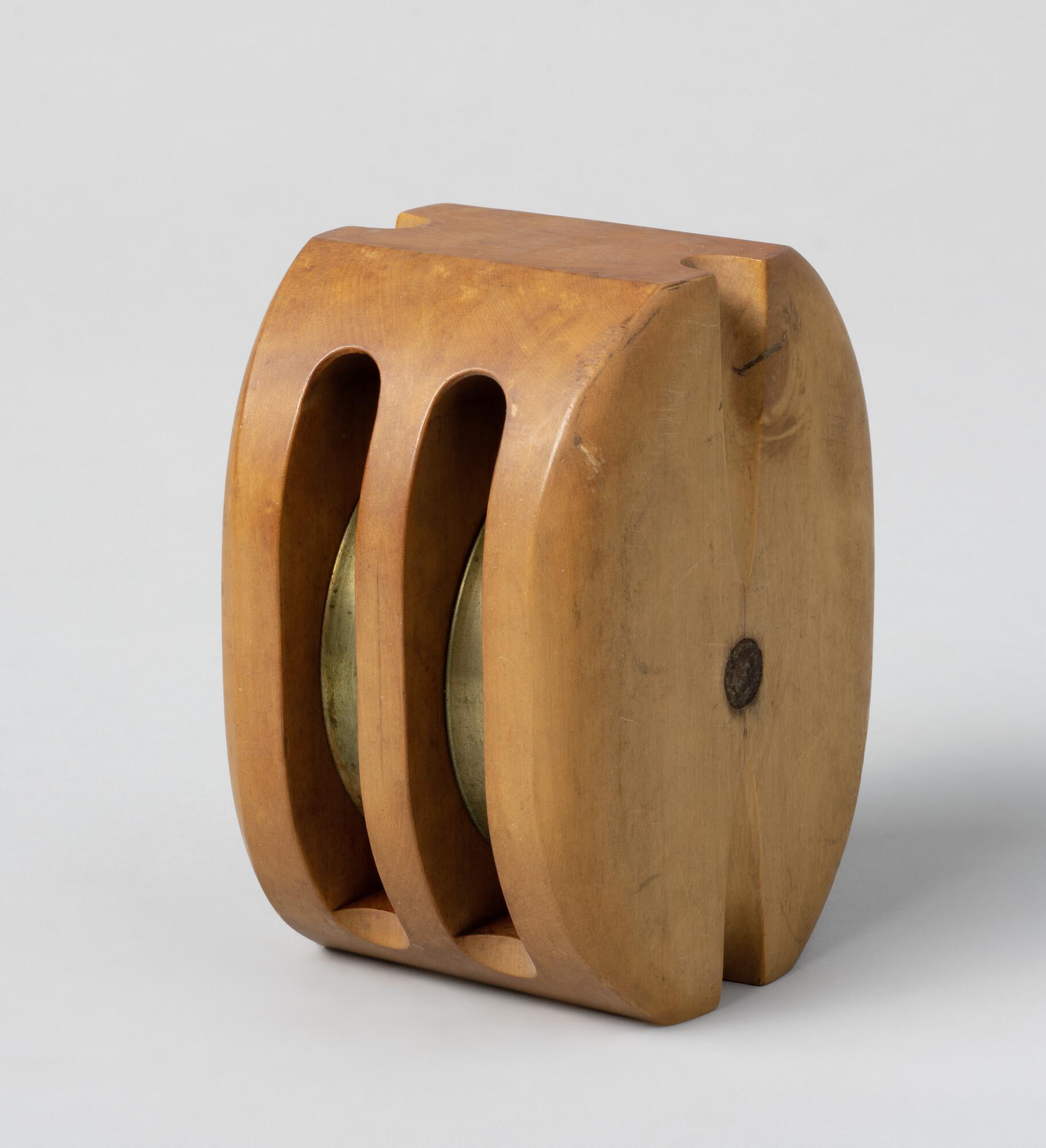 Blok, vruchtboomhout, met twee bronzen schijven en ijzeren nagel