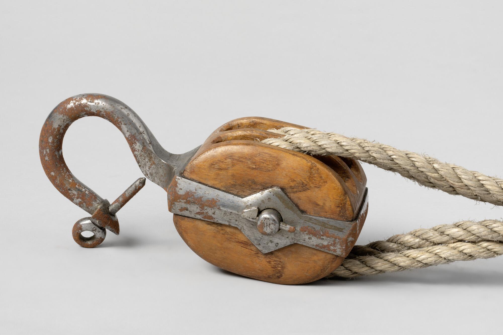 Iepenhouten blok met twee bronzen schijven, ijzeren nagel met ijzeren beletbeslag waarvan haak over de schijf. Haak heeft borging. Aan volgnummer 44 gestropt.