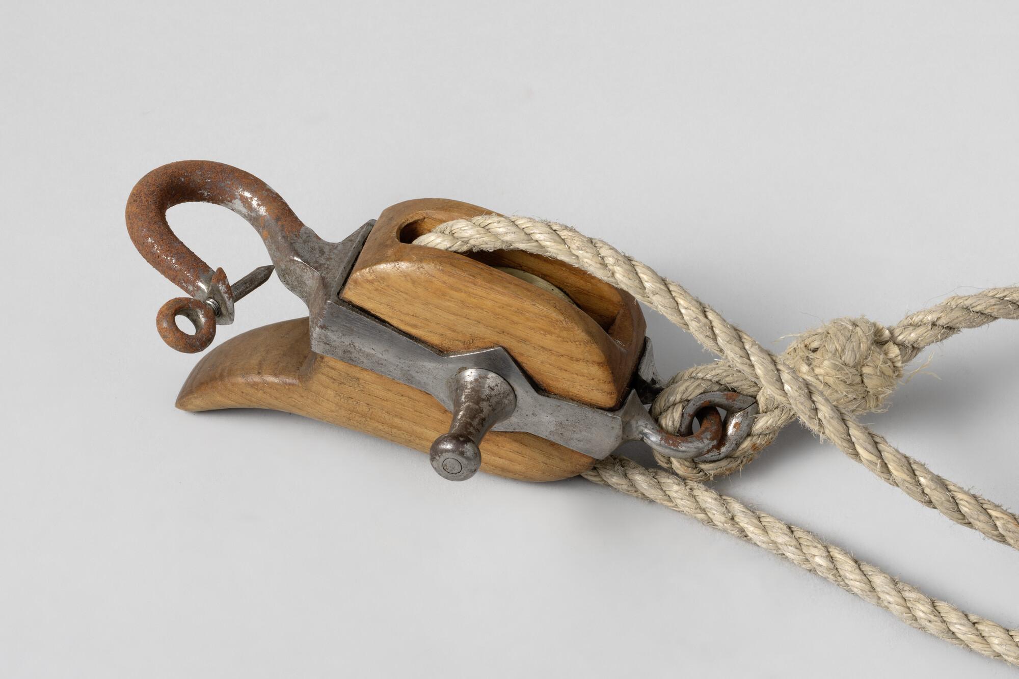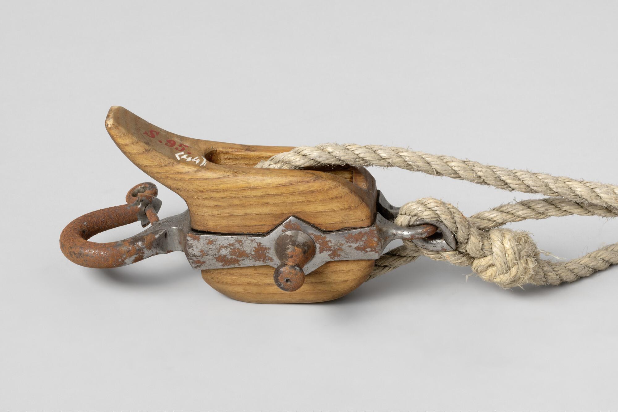 Iepenhouten blok met bronzen schijf, ijzeren nagel, met ijzeren beslag met haak met borgschroef als muizing, kous en verlengde nagel haak heeft borging. Het blok heeft een houten lip. Aan volgnummer 42 gestropt.