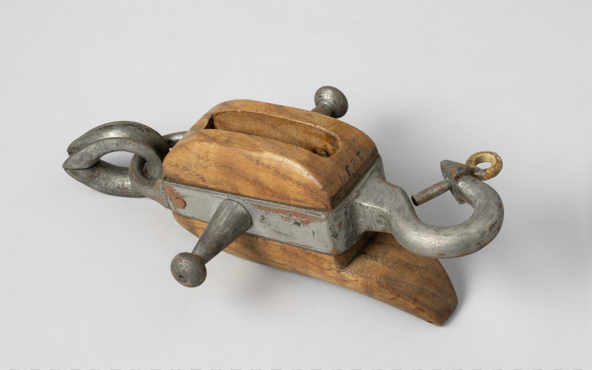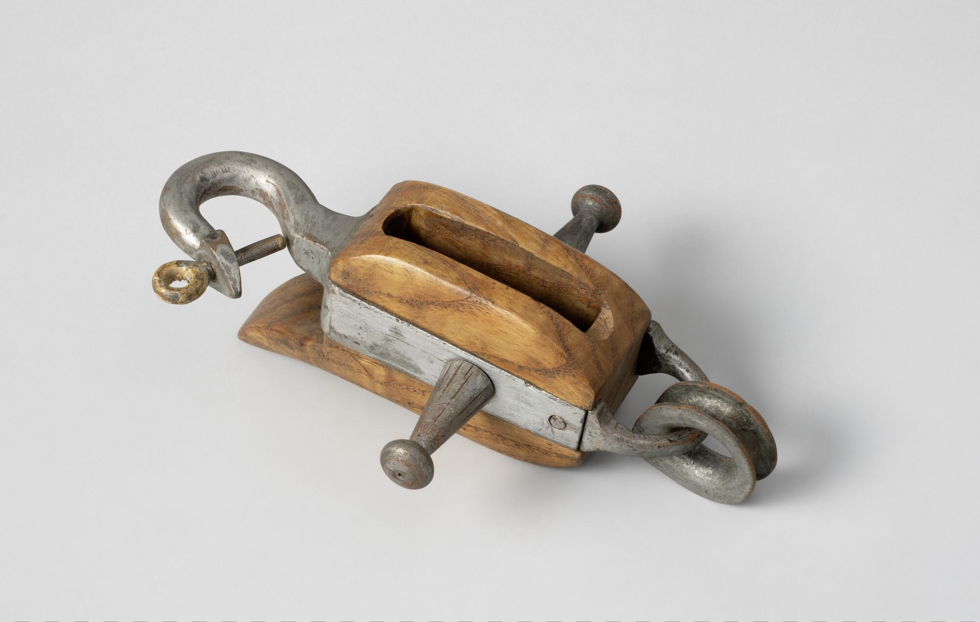 Iepenhouten blok, normaal met metalen schijf maar deze ontbreekt. Met ijzeren nagel en beslag met haak met borgschroef als muizing, kous en verlengde nagel, haak heeft borging. Het blok heeft een houten lip. Boomschoten voor kleine vaartuigen (sloep).
