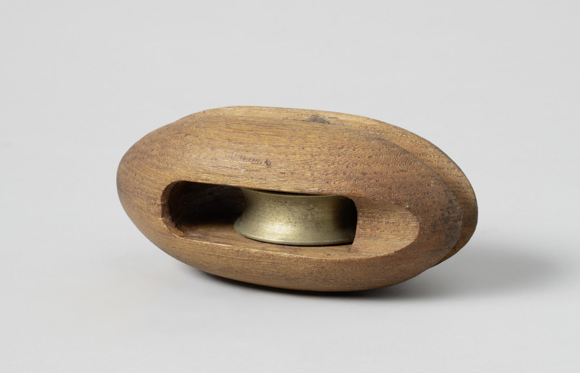 Iepenhouten blok met bronzen schijf, ijzeren nagel. Blok van aan weerskanten toegespitste vorm en geneut. In gebruik geweest aan de seinmasten van monitors en kanonneerboten.