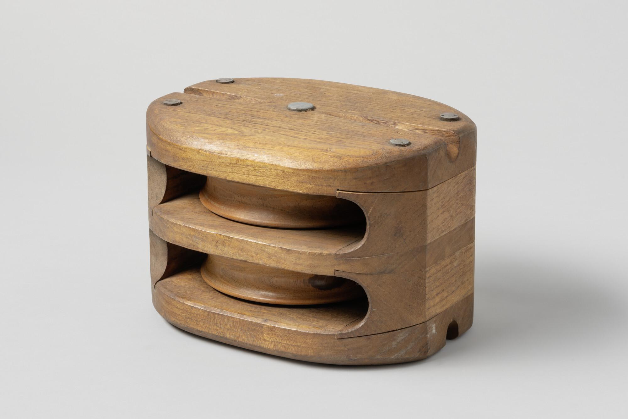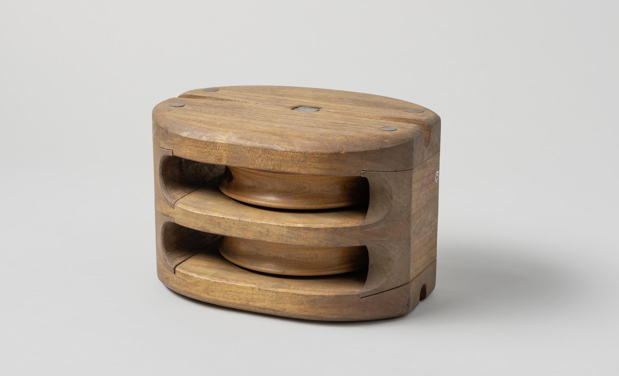Iepenhouten blok met pokhouten schijven, ijzeren nagel. Het blok is geneut.