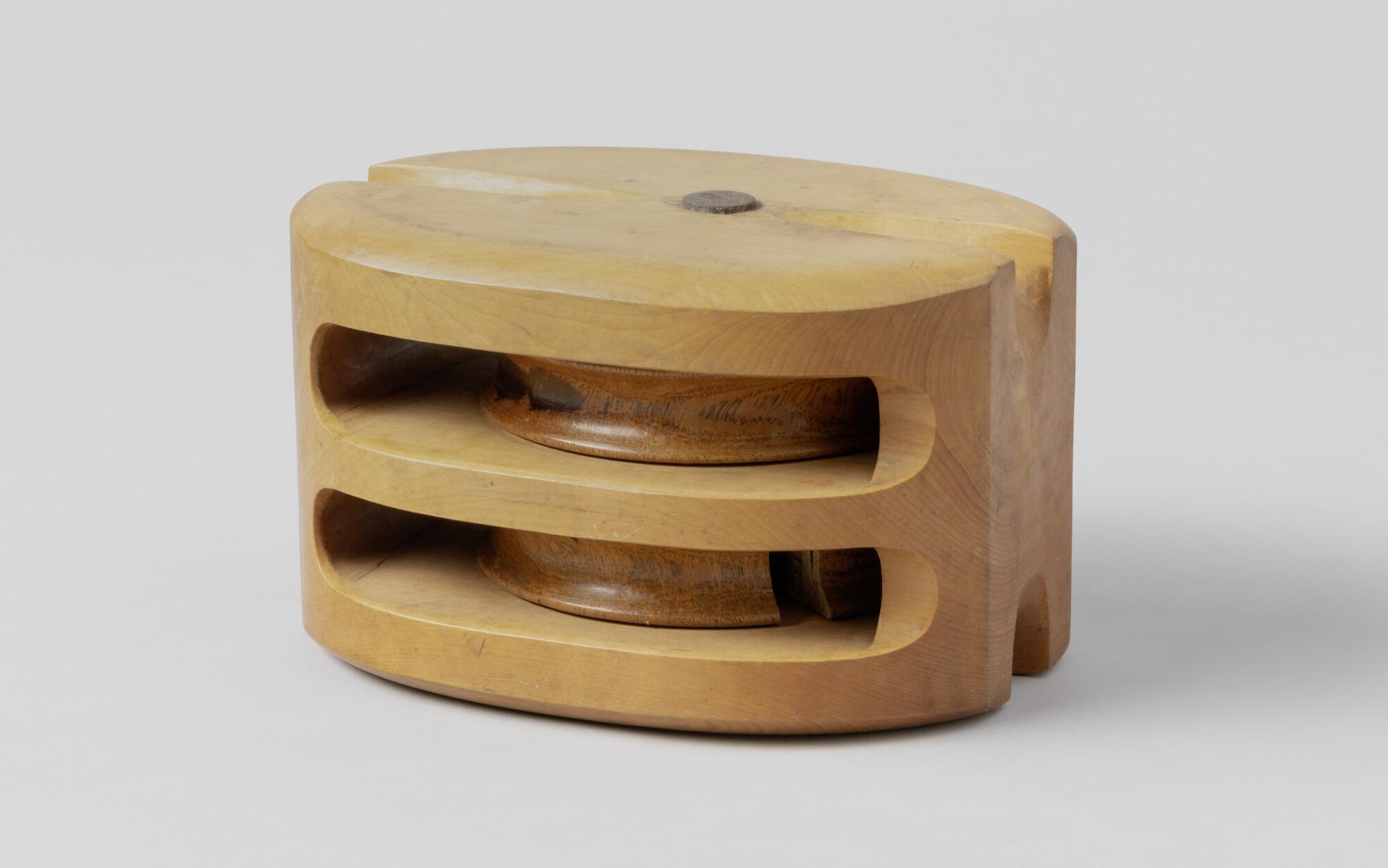 Gewoon blok. Vruchtboomhout met pokhouten schijven en ijzeren nagel, enkel geneut.