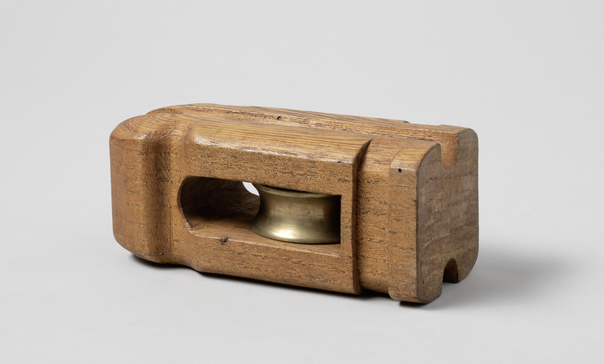 Iepenhouten blok voor bramwant, topeind, met bronzen schijf en ijzeren nagel, gemerkt met vier maal gekroonde gekruiste ankers en No. 14 en 1876. Niet voor raschepen; voor gebruik op kanonneerboten.