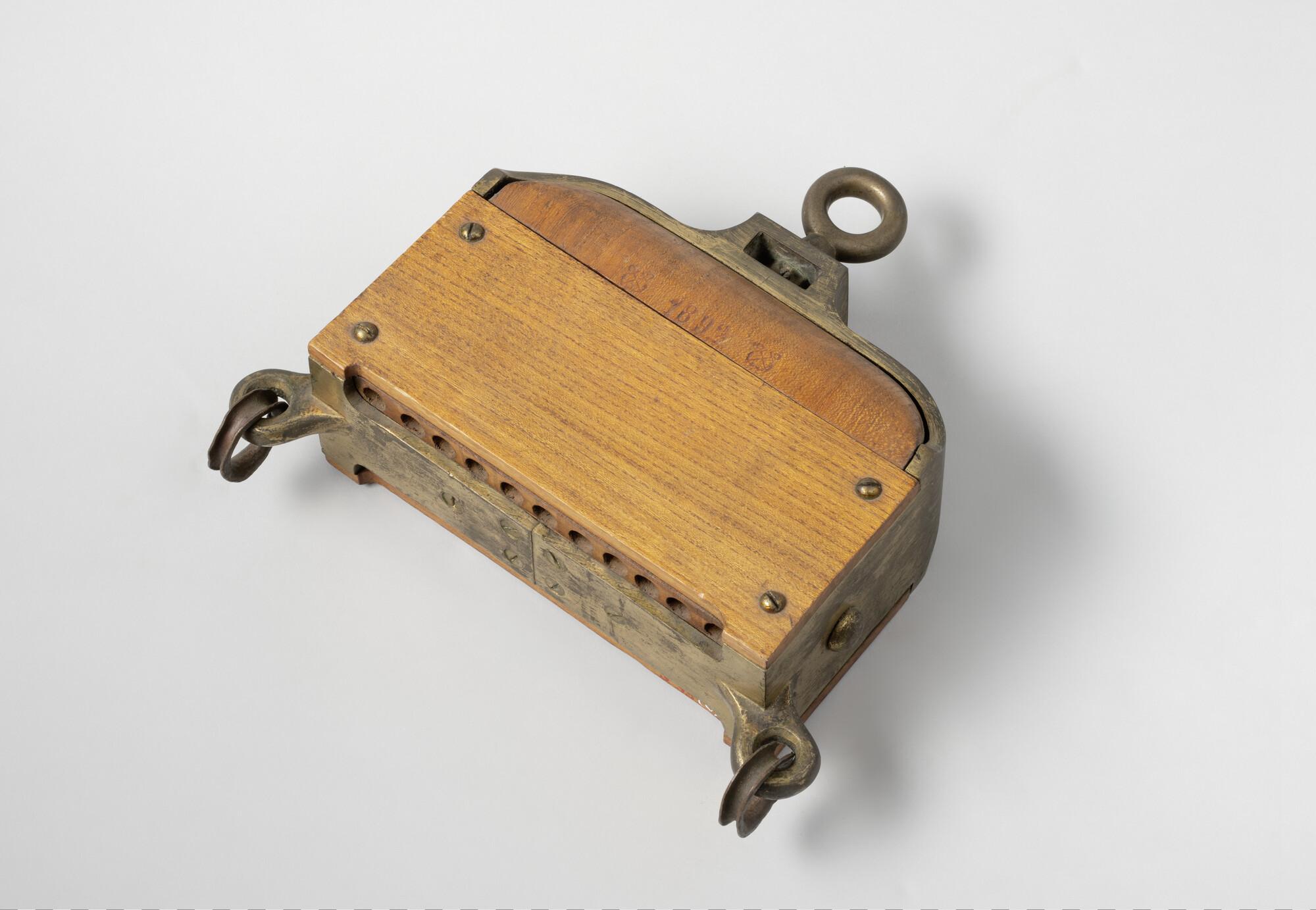 Telegrafisch seinblok van iepenhout met bronzen schijven en messing beslag, en ijzeren nagels. Voorzien van 11 schijven. houten dekstuk, twee schijven ontbreken. Gemerkt met 2x gekroonde gekruiste ankers en jaartal 1892.