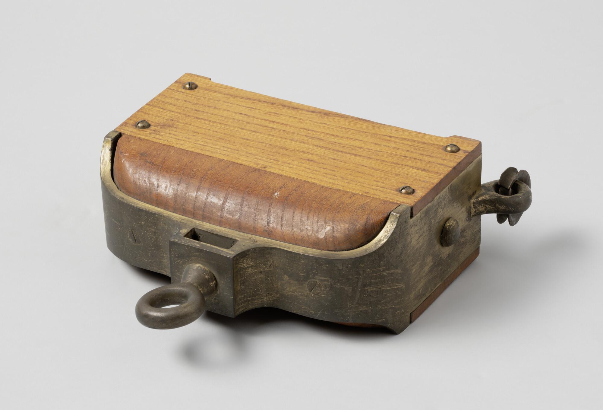 Telegrafisch seinblok van iepenhout met bronzen schijven en messing beslag, en ijzeren nagels