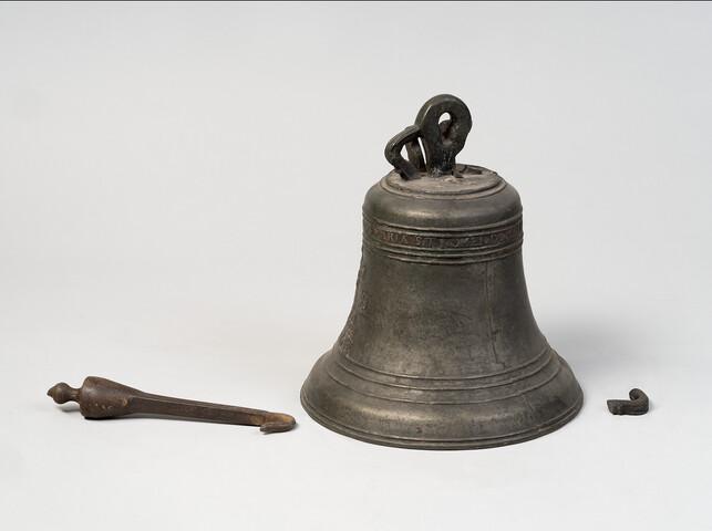Scheepsbel. Met ijzeren draagbeugel en ijzeren klepel.