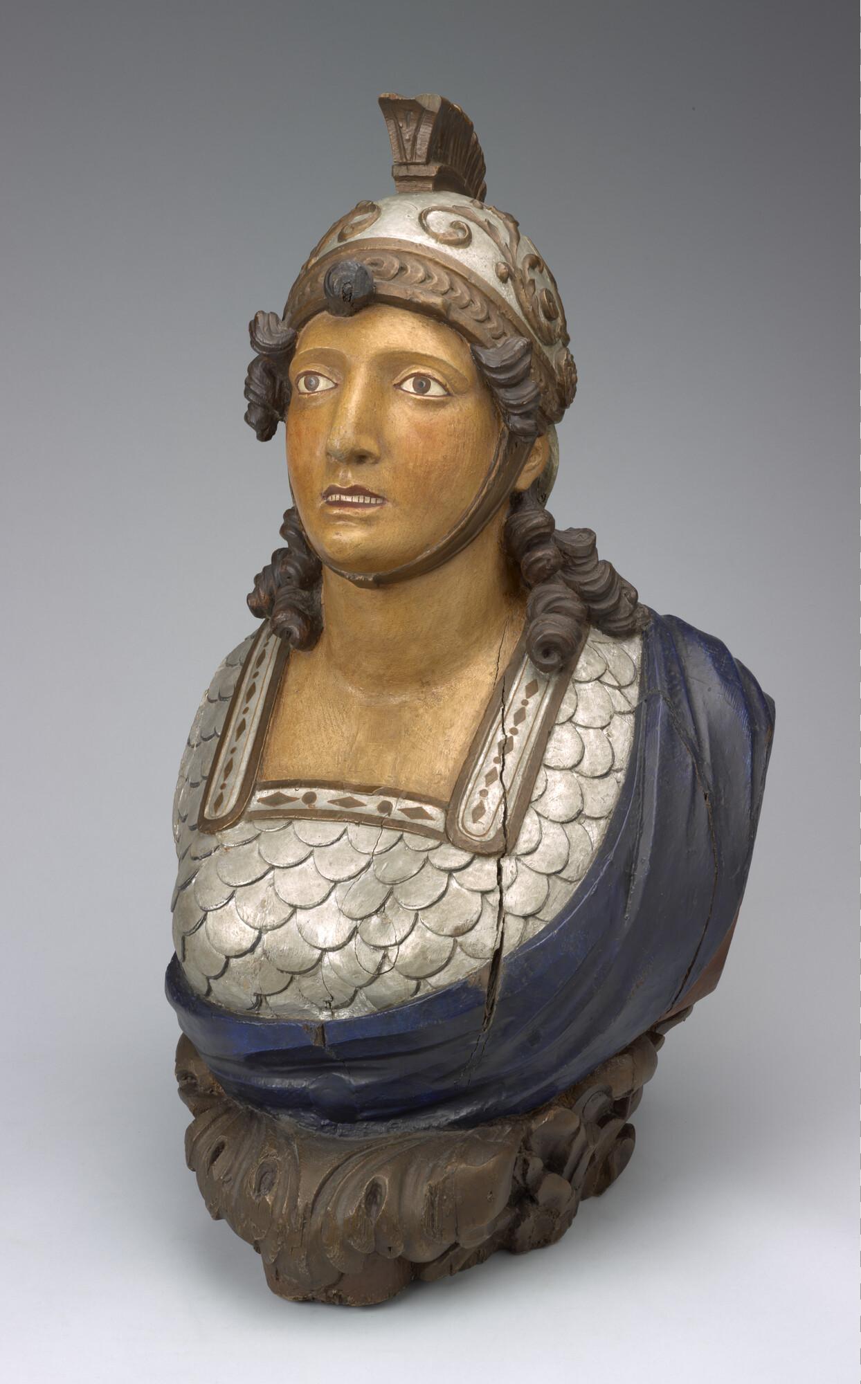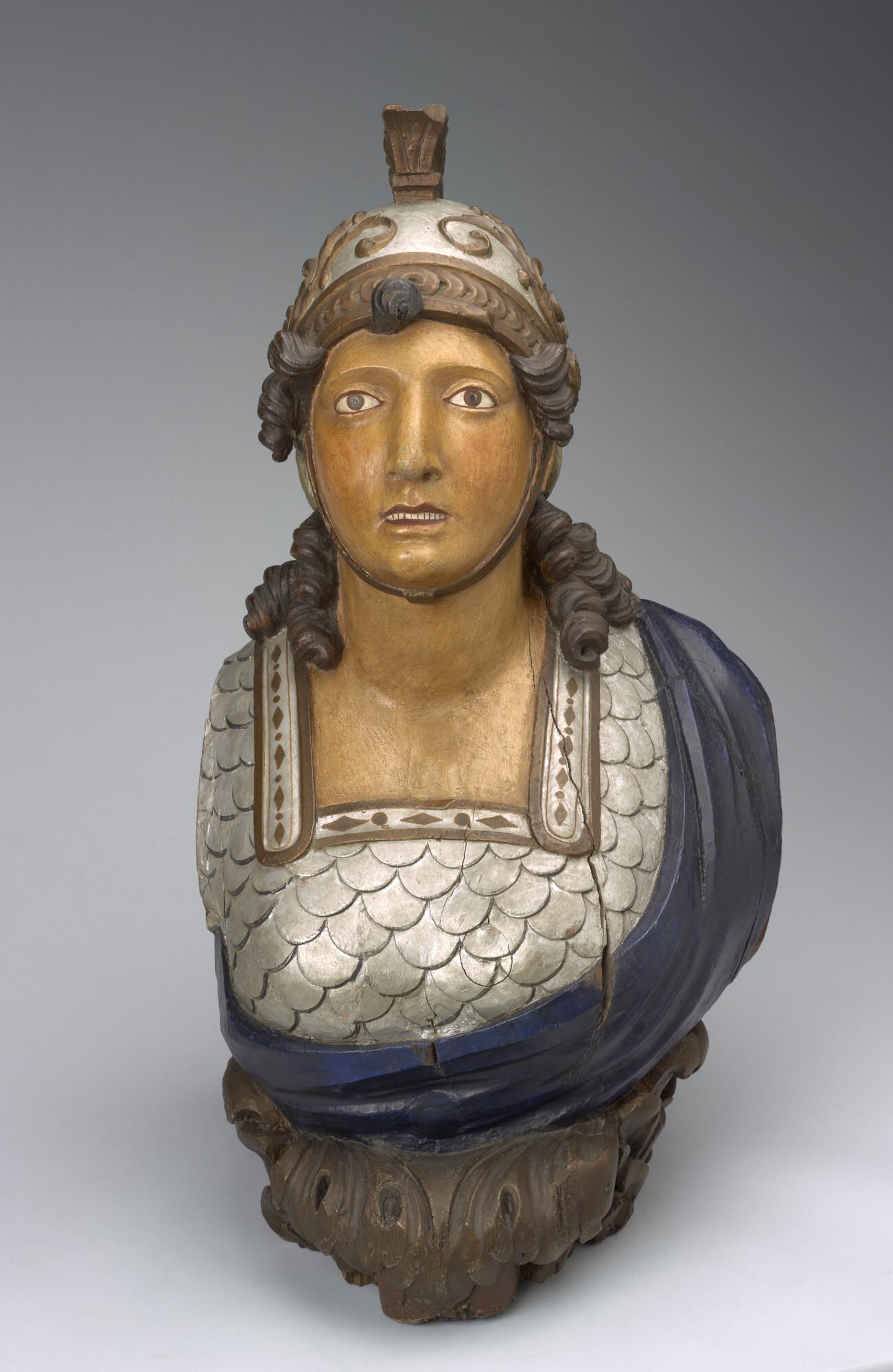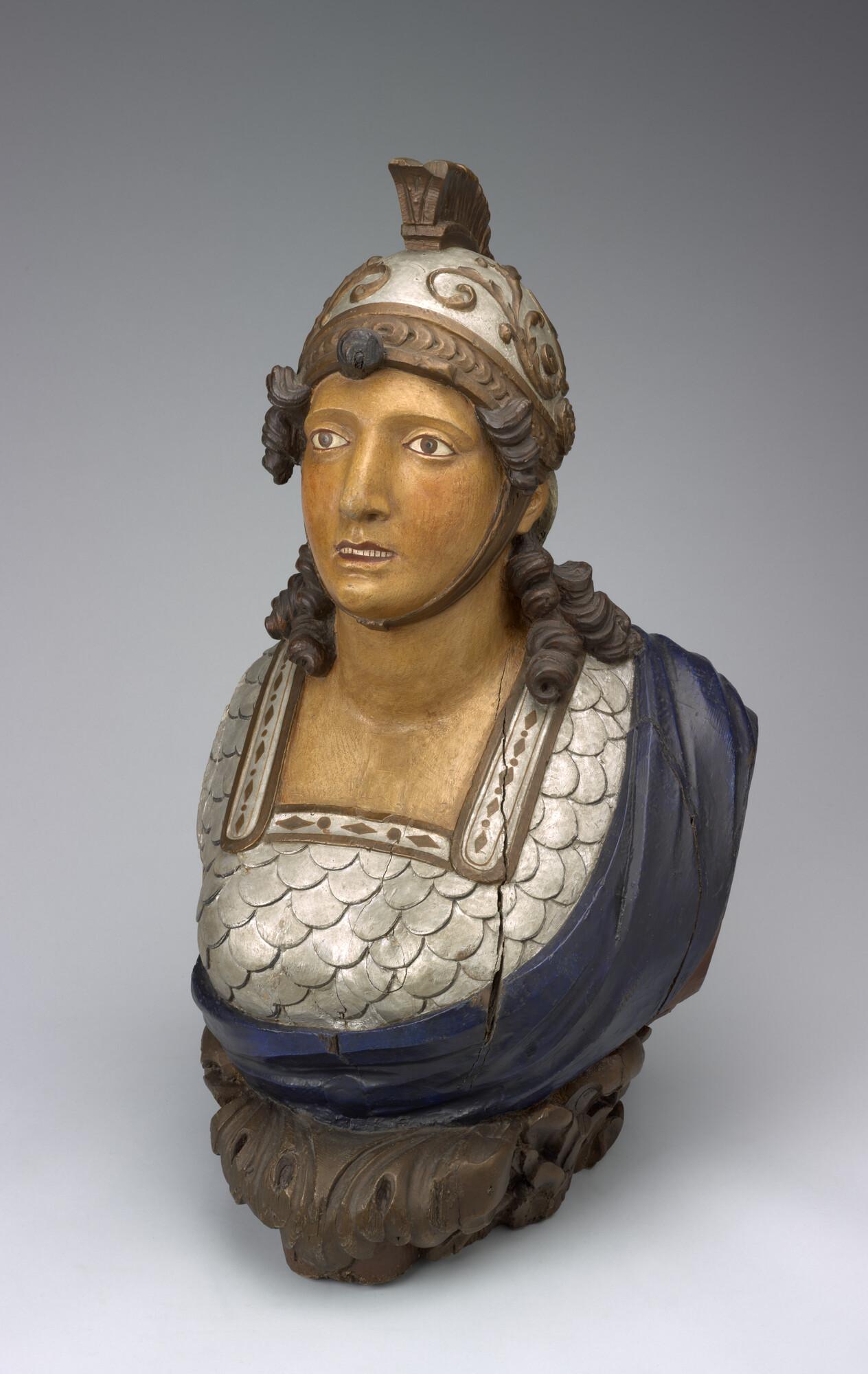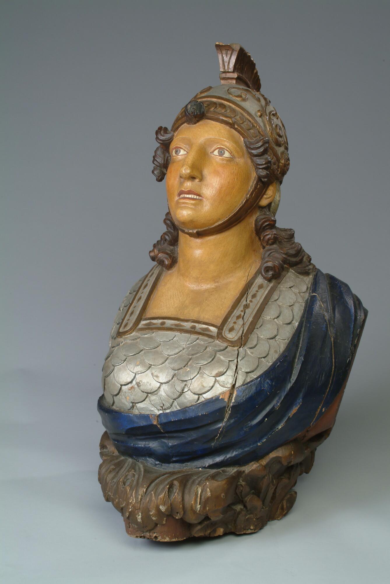 Schegbeeld (buste) in de vorm van een vrouwenfiguur in zilverkleurige Romeinse tunica.