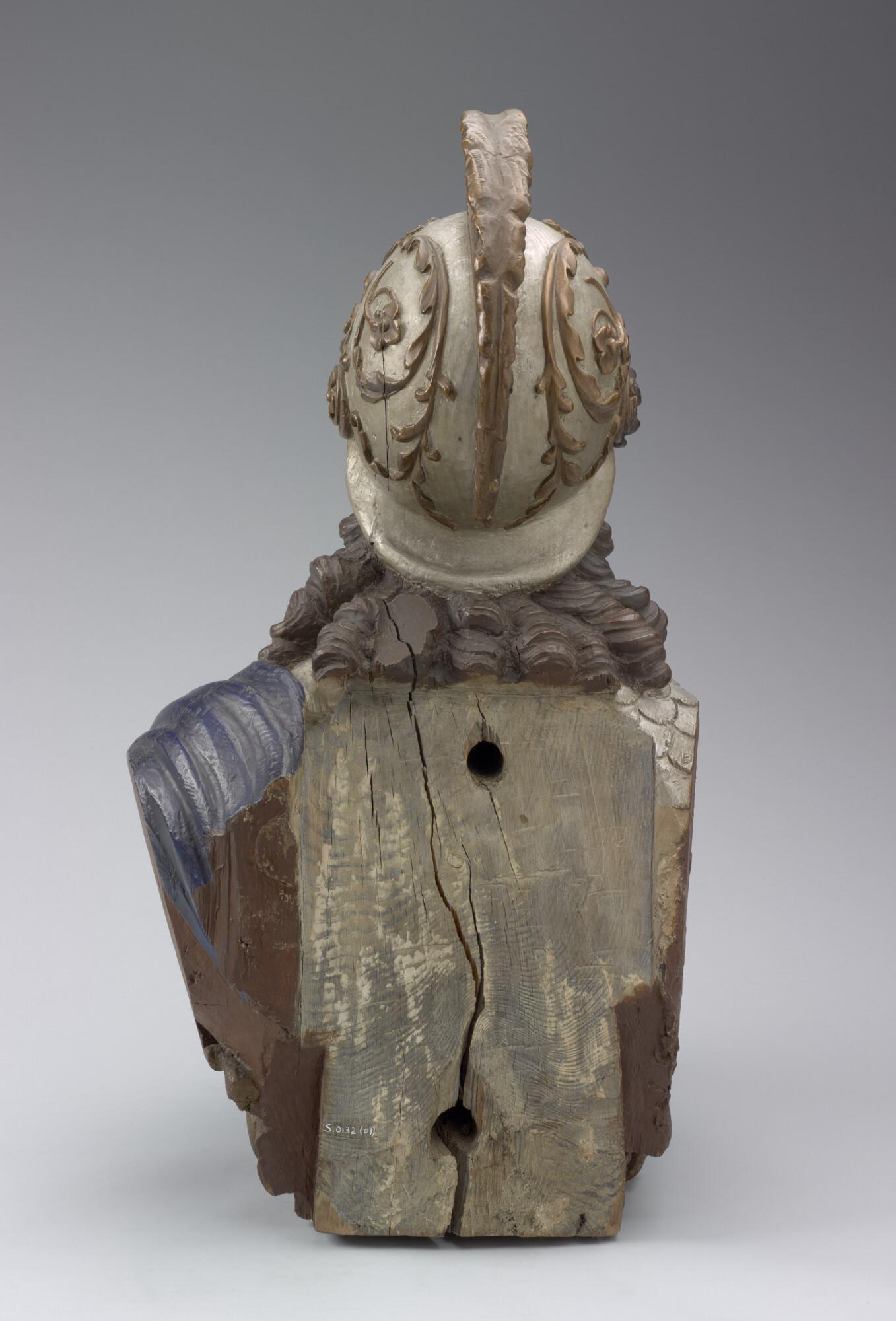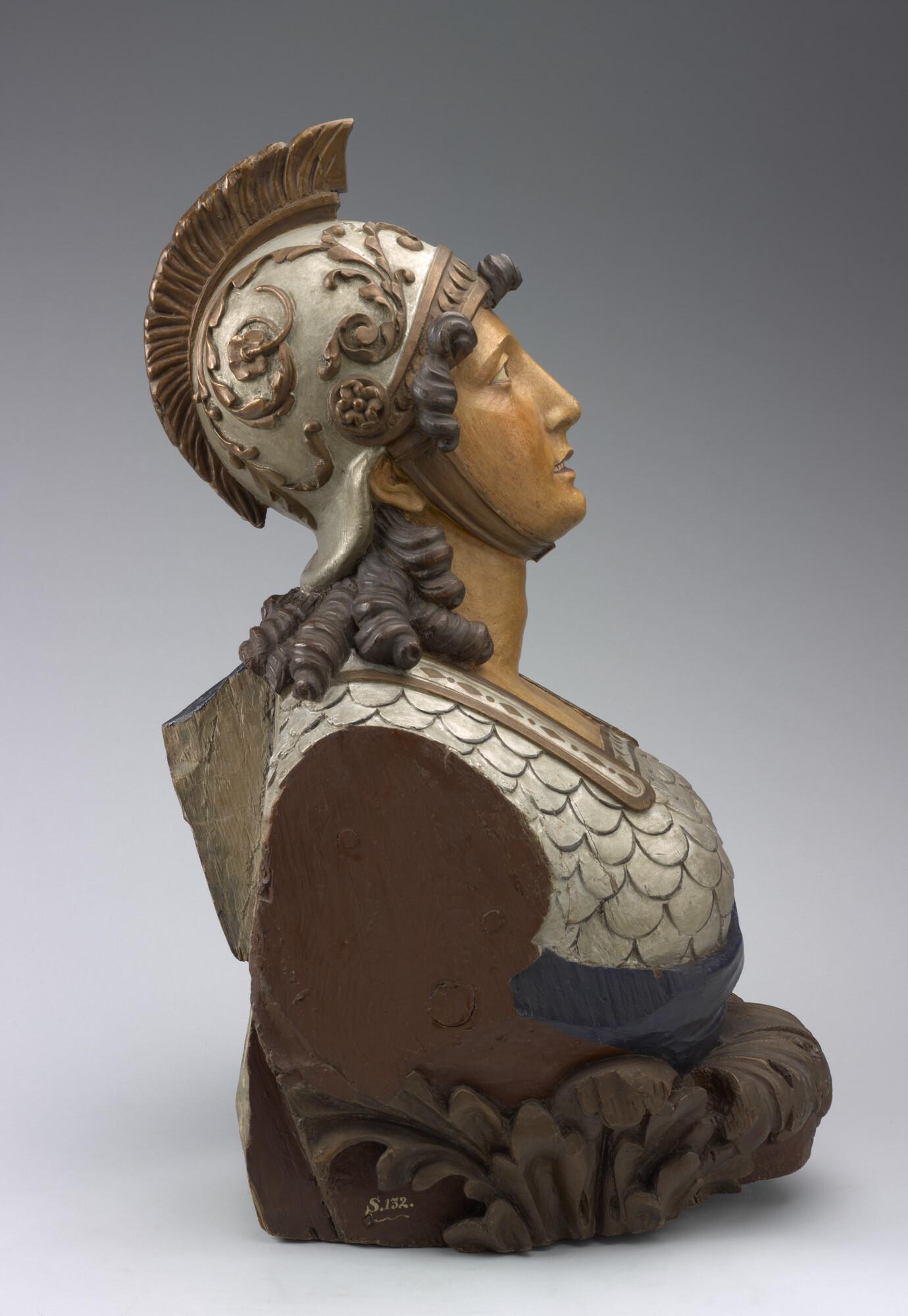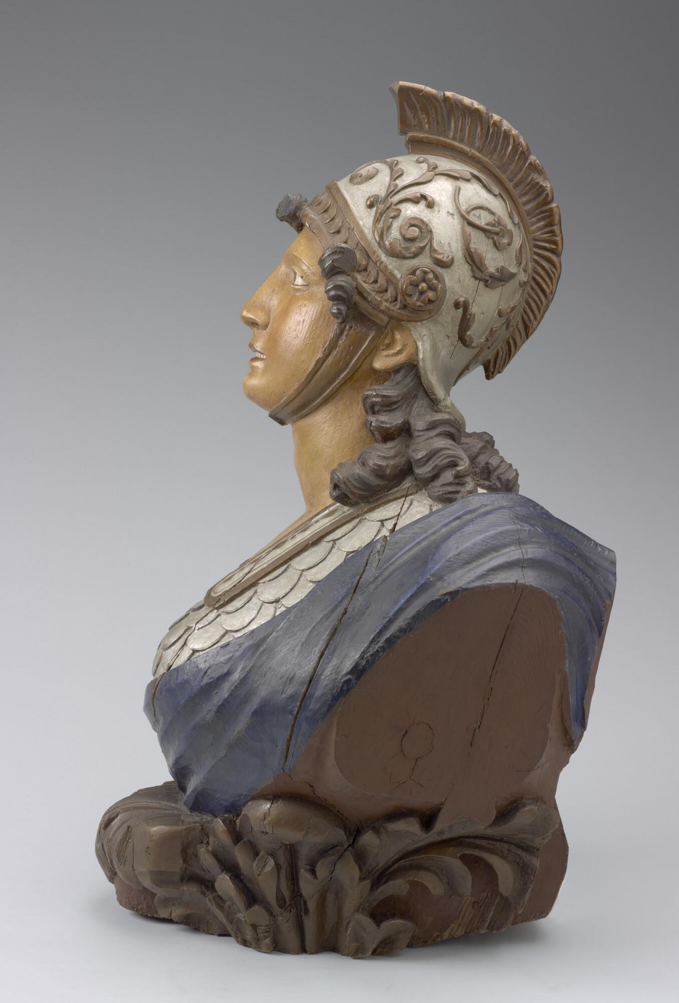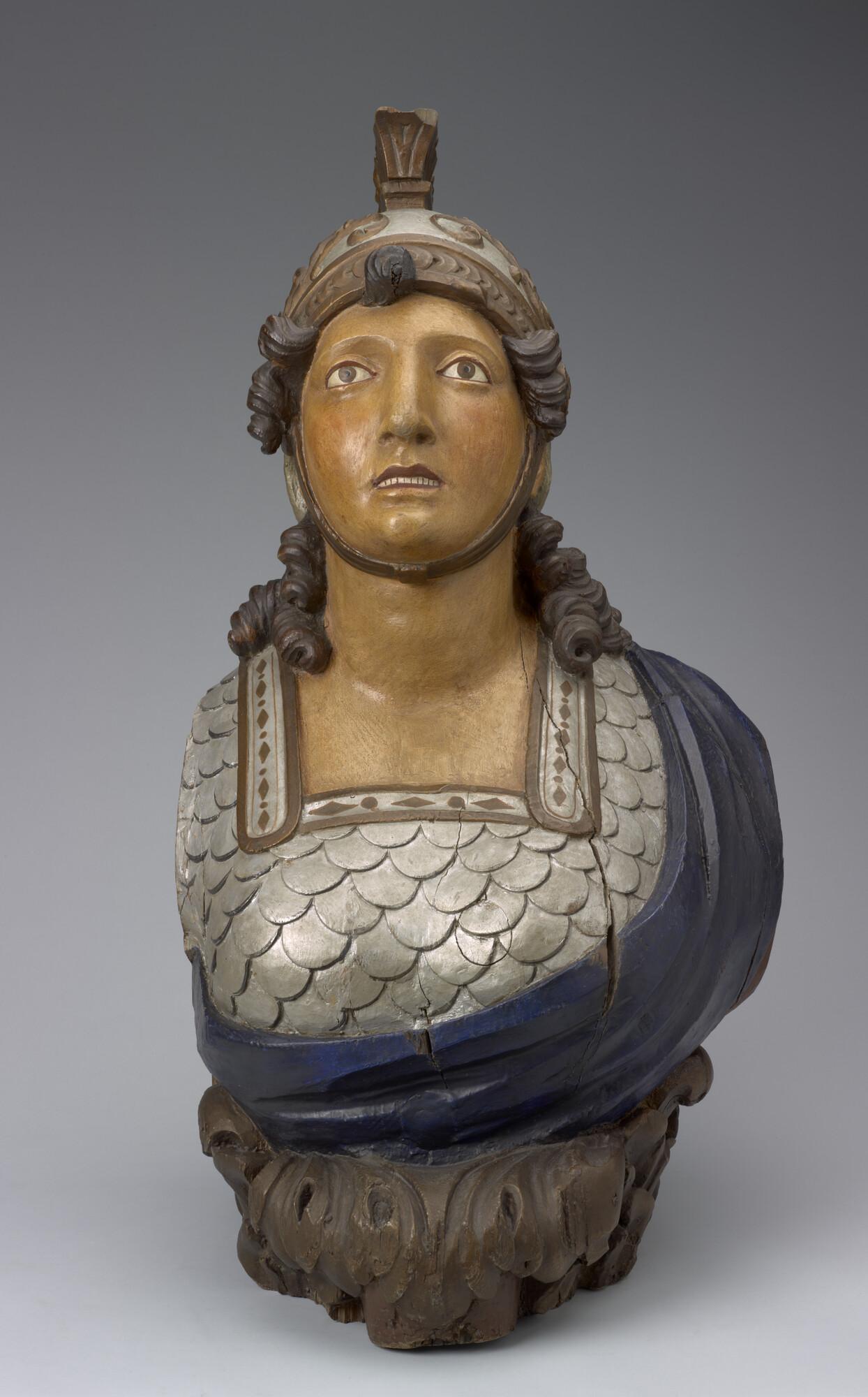Schegbeeld (buste) in de vorm van een vrouwenfiguur in zilverkleurige Romeinse tunica.