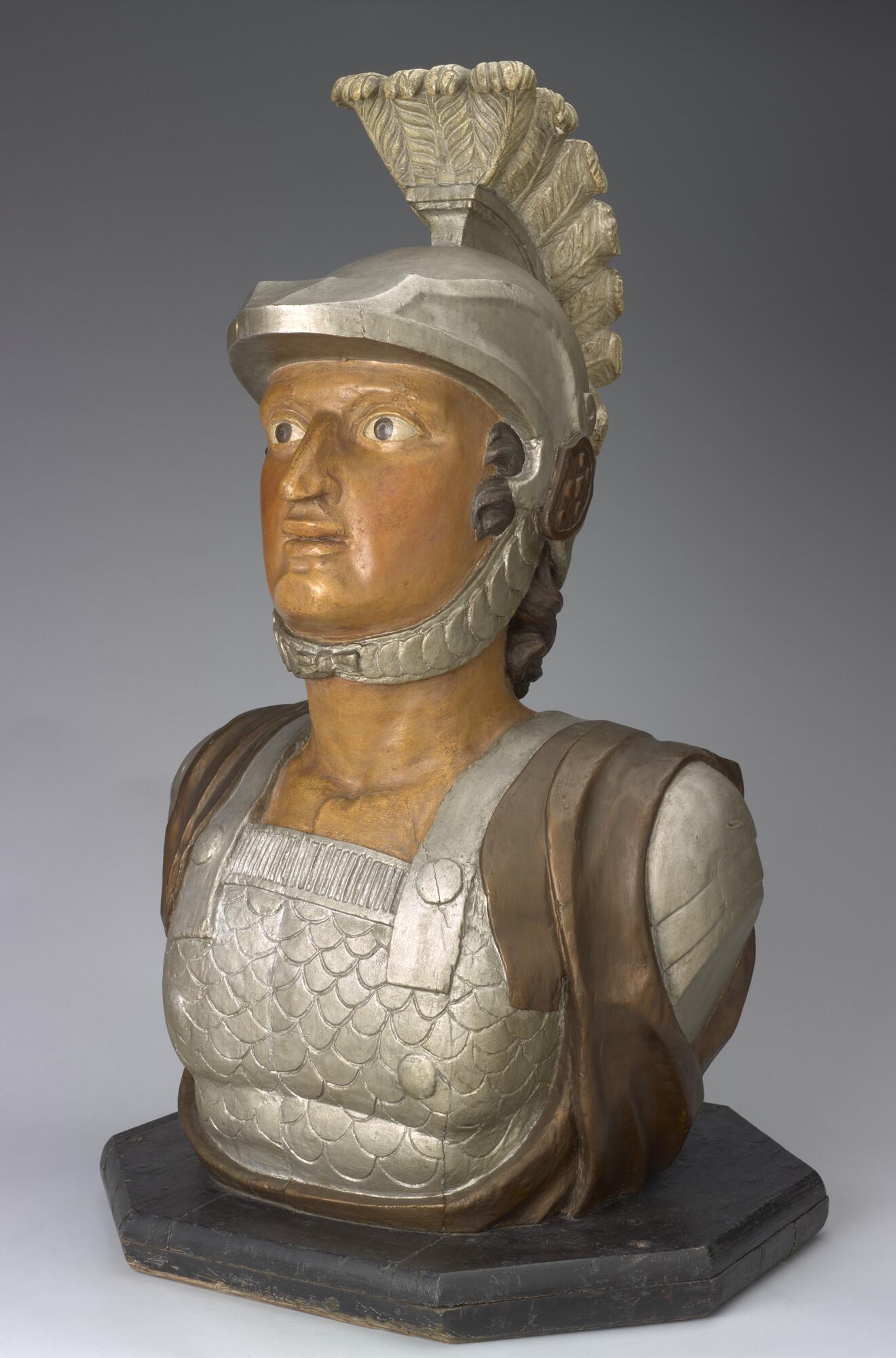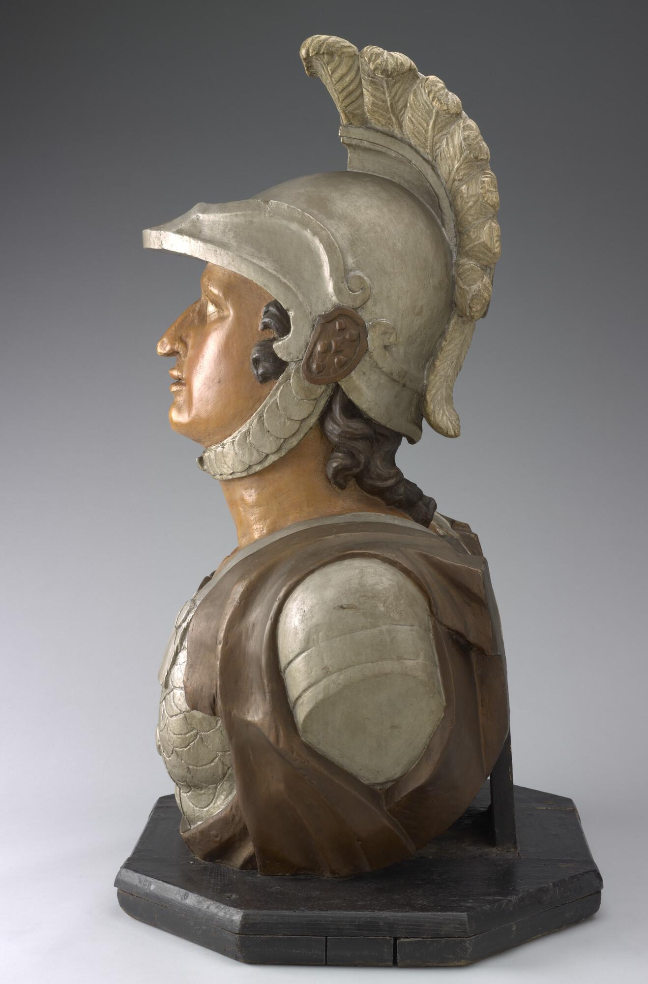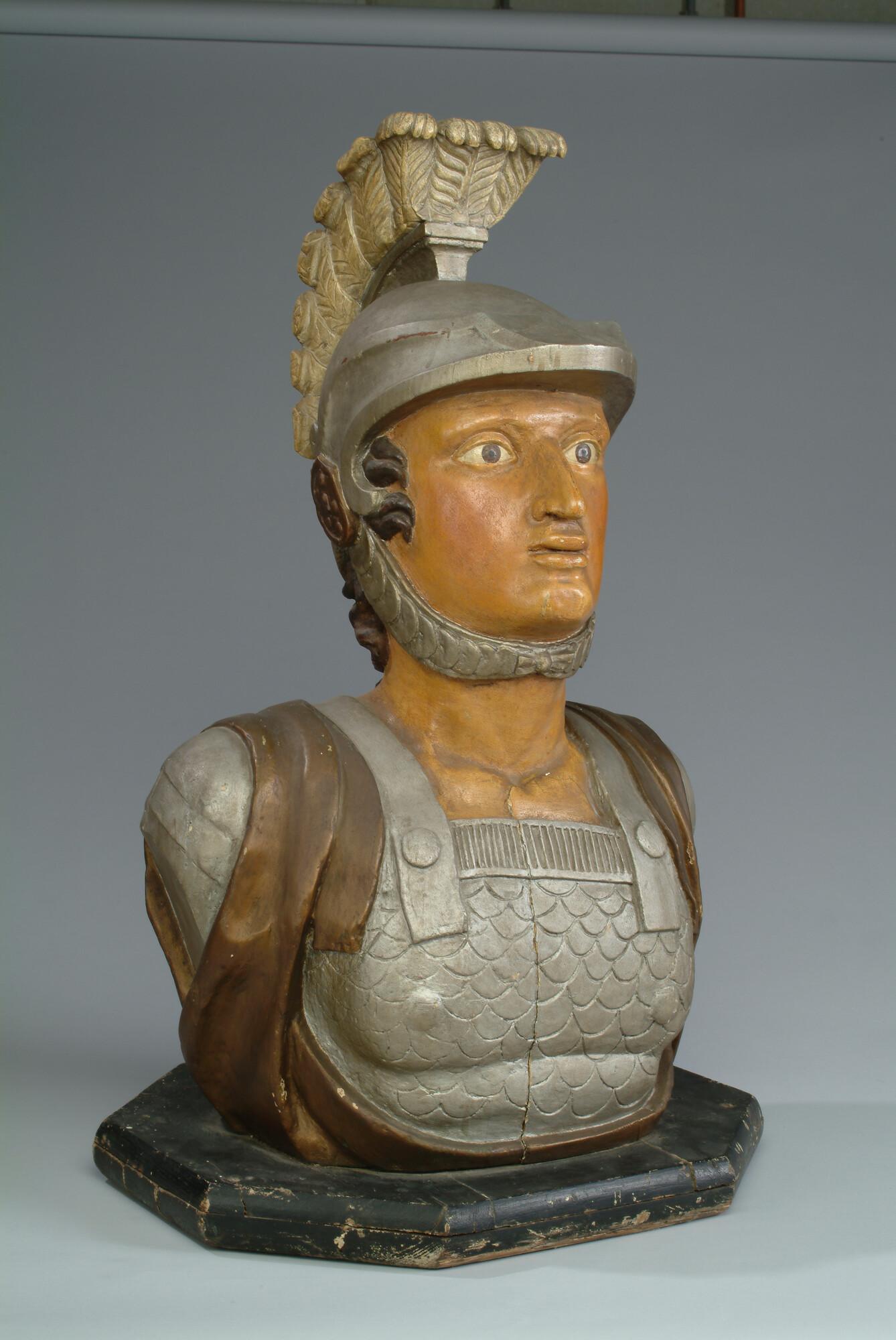 Schegbeeld (buste) in de vorm van een mannefiguur voorstellend een gehelmde strijder in zilverkleurige Romeinse tunica, afkomstig van het schroefstoomschip der 2de klasse Zr.Ms. 'Vice Admiraal Koopman'. Het beeld staat op een achtkantige, zwarte, houten onderplaat.