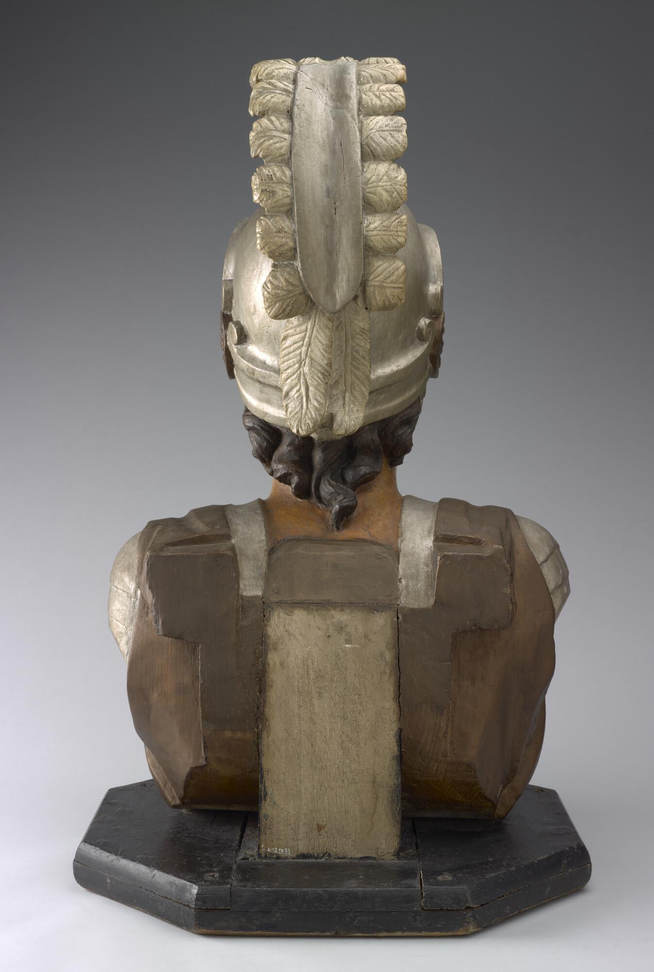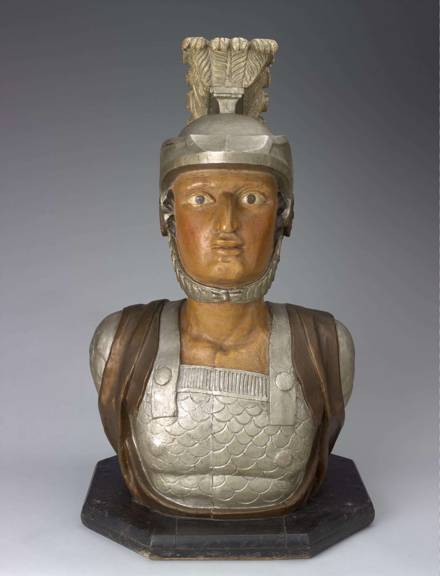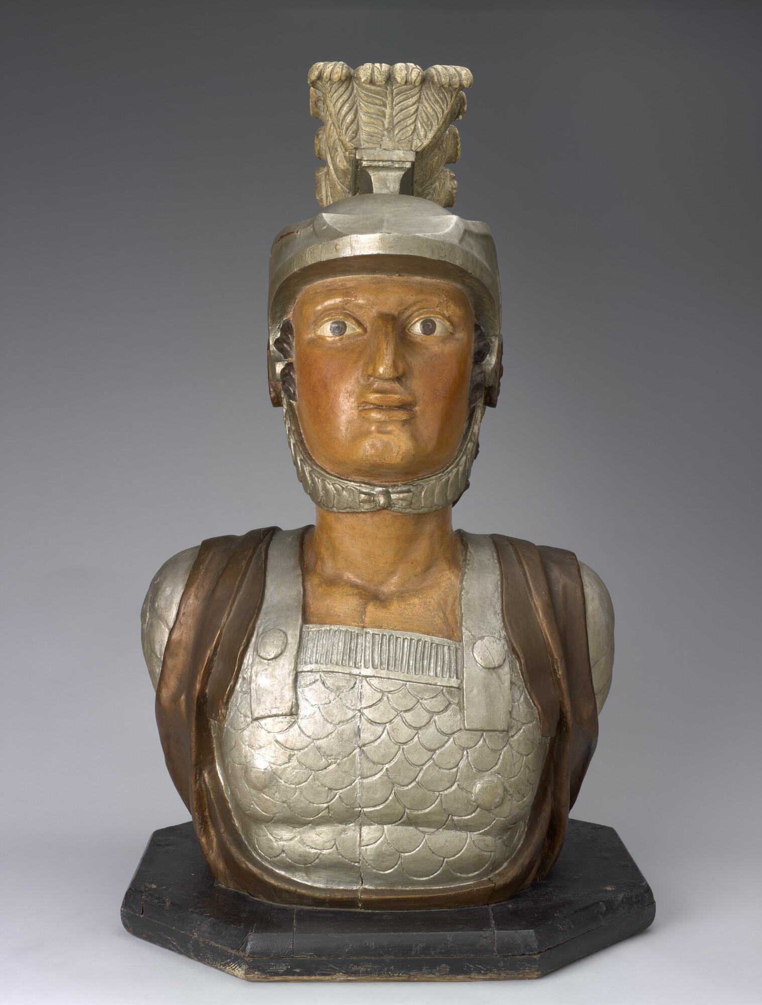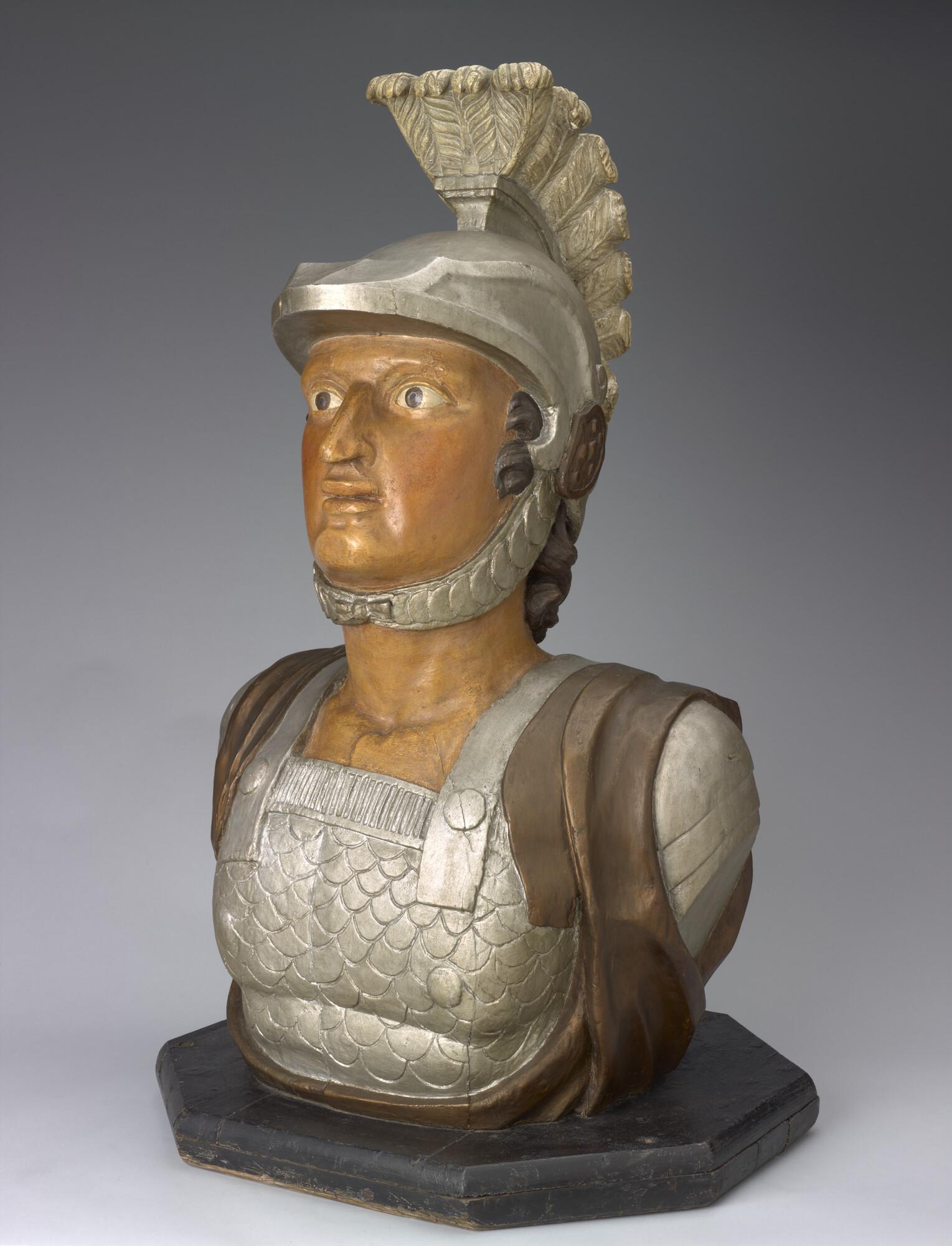 Schegbeeld (buste) in de vorm van een mannefiguur voorstellend een gehelmde strijder in zilverkleurige Romeinse tunica, afkomstig van het schroefstoomschip der 2de klasse Zr.Ms. 'Vice Admiraal Koopman'. Het beeld staat op een achtkantige, zwarte, houten onderplaat.