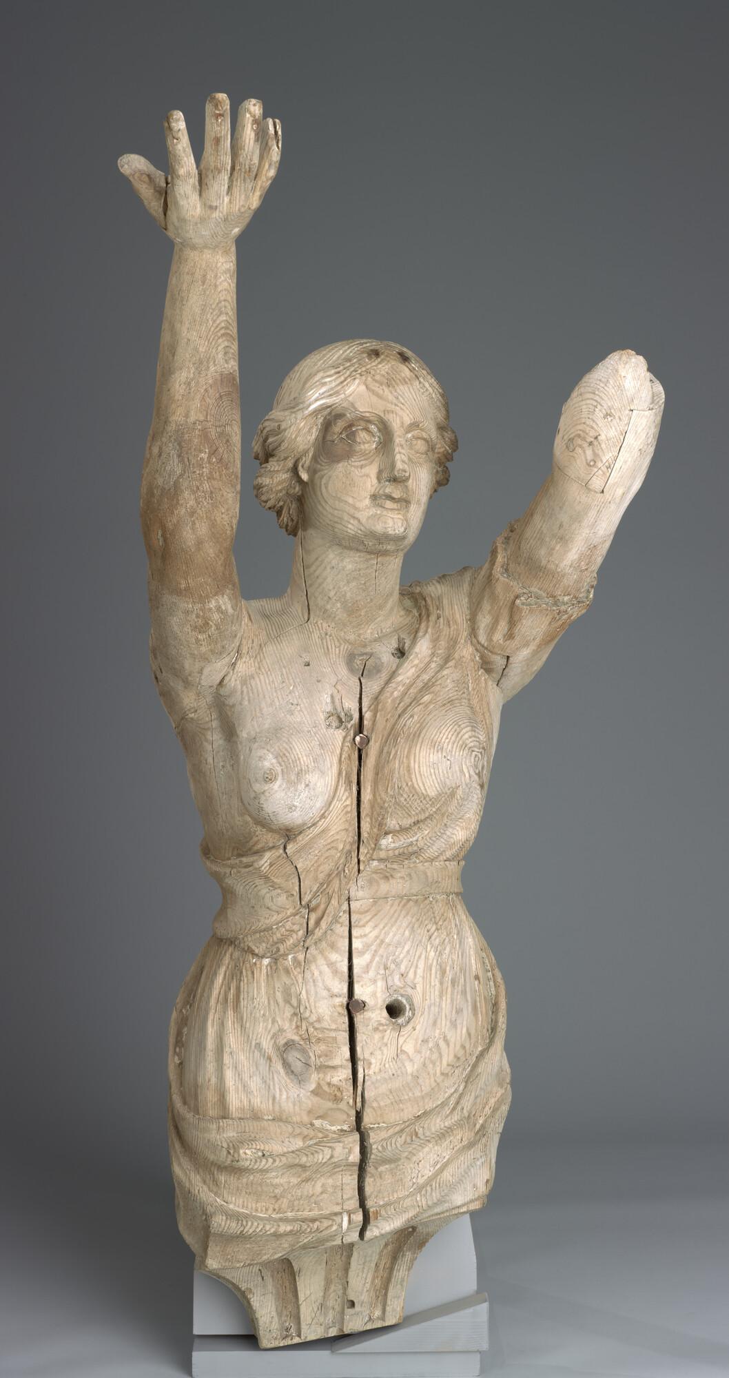 Console (kniestuk) in de vorm van een vrouwenfiguur. Met omhoog reikende rechterarm. De handpalm en de vingers zijn afgevlakt. De linker onderarm ontbreekt. Aan de onderzijde van het kniestuk bevindt zich een gewelfd houten deel met vijf gleuven.