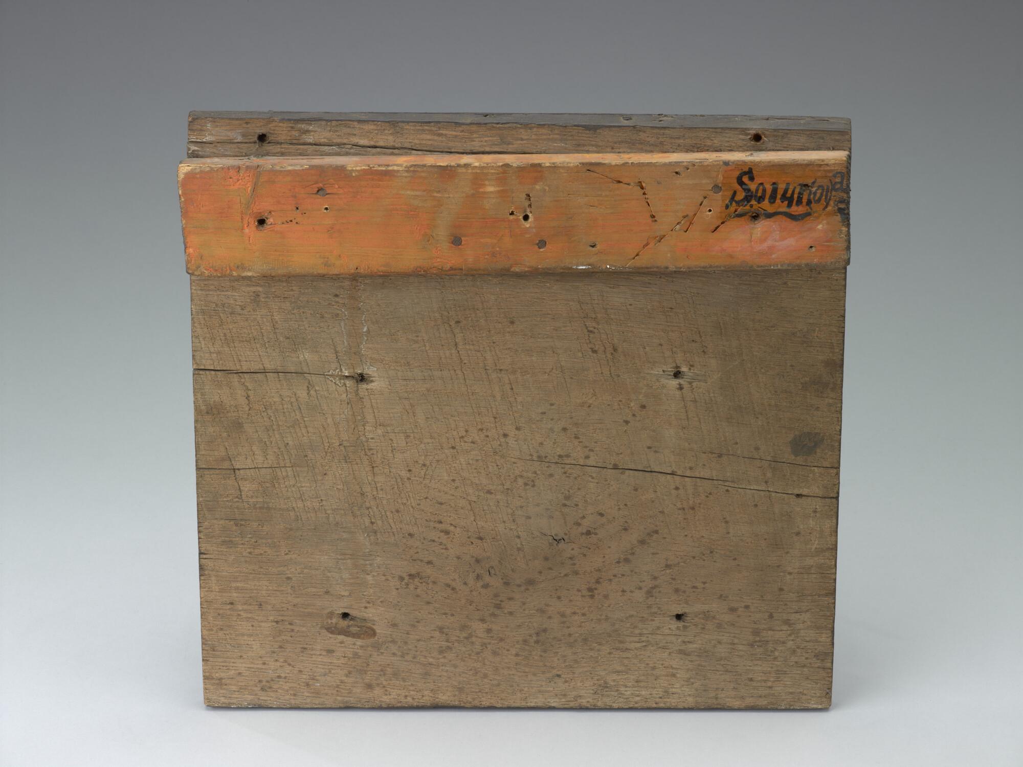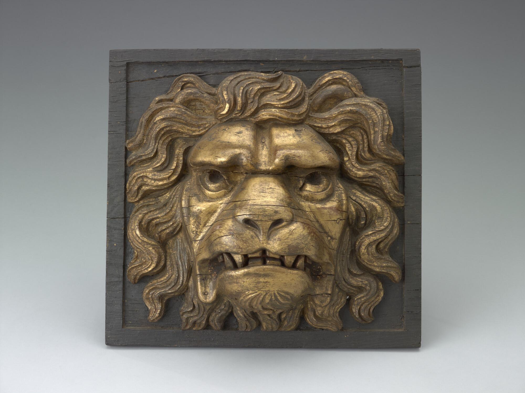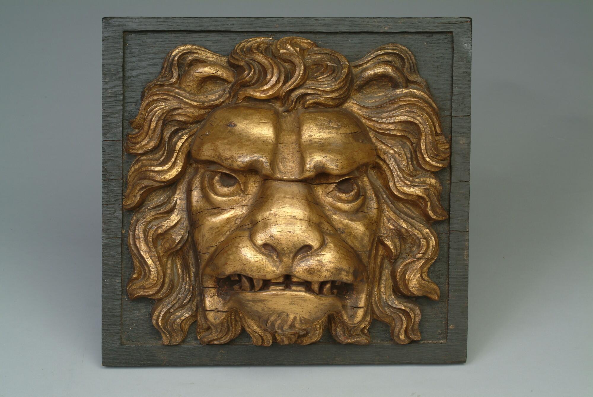 Een vergulde leeuwenkop bevestigd op een vierkant zwart houten bord met opstaande rand.