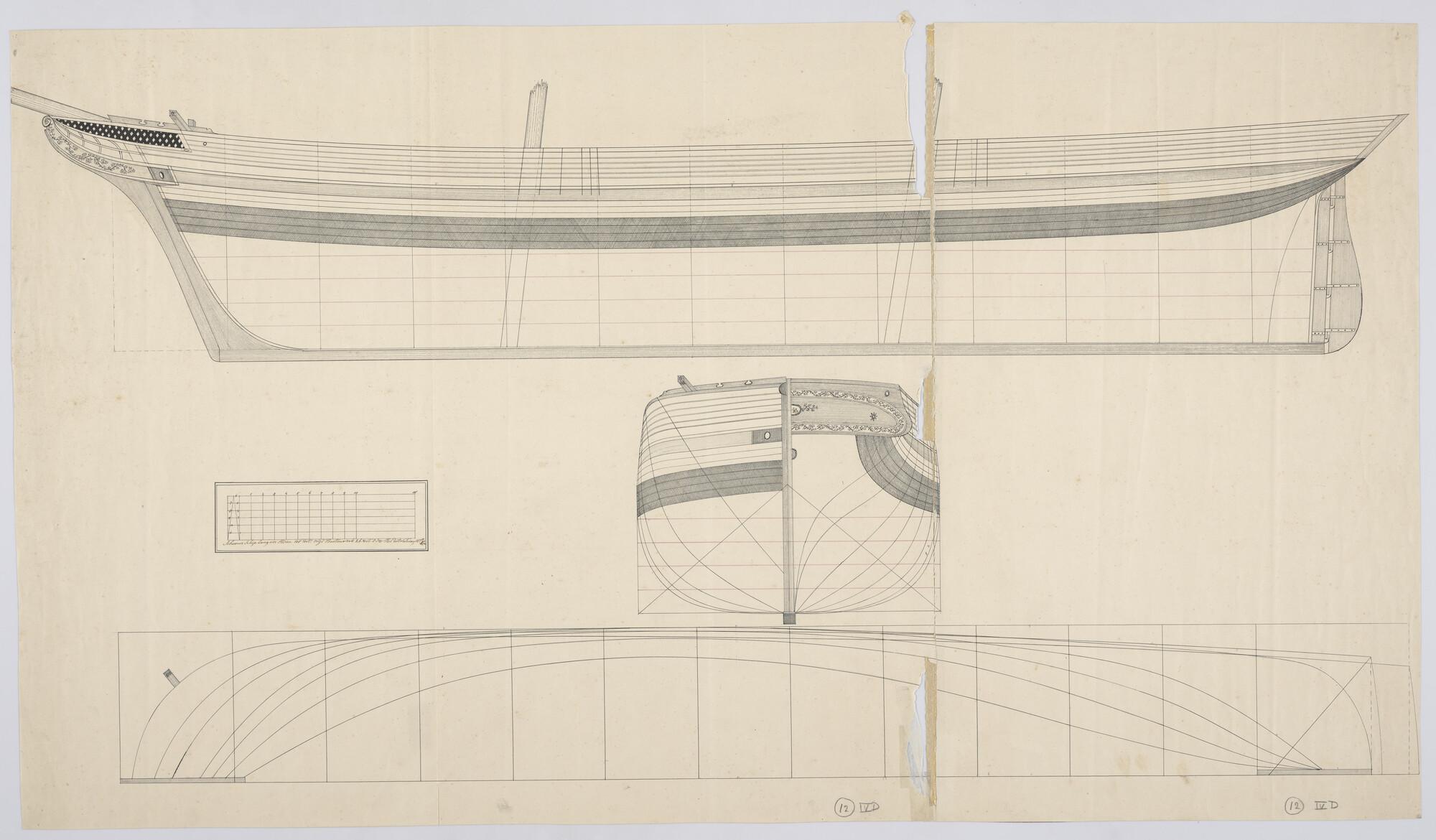 Zijaanzicht, vooraanzicht, achteraanzicht, lijnenplan van een schoener 105 x 26 x 13.5 voet.