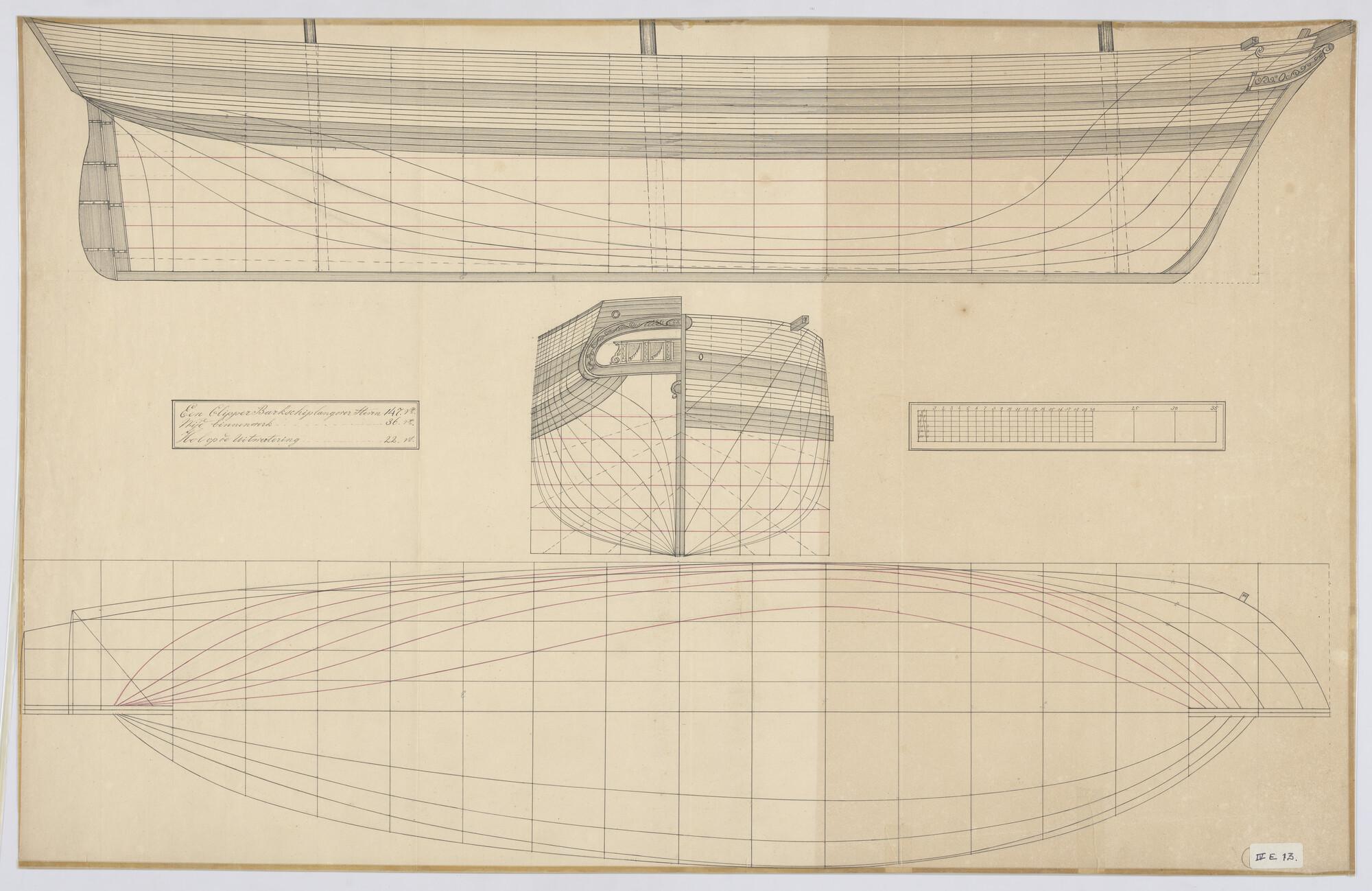 Klipperbarkschip: zijaanzicht, vooraanzicht, achteraanzicht, spantenraam, waterlijnen, senten, verticalen. Afmetingen 147 x 36 x 22 voet.