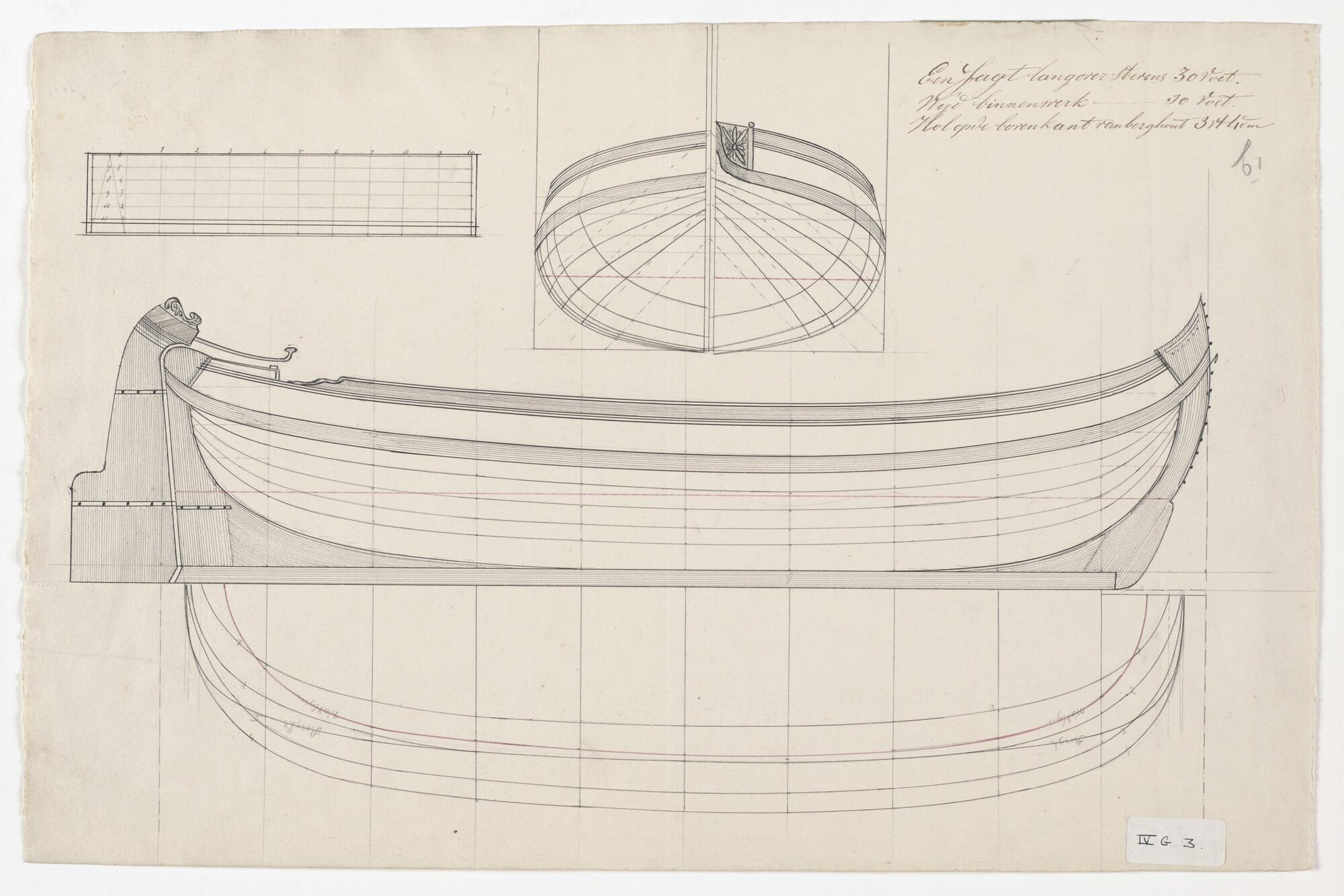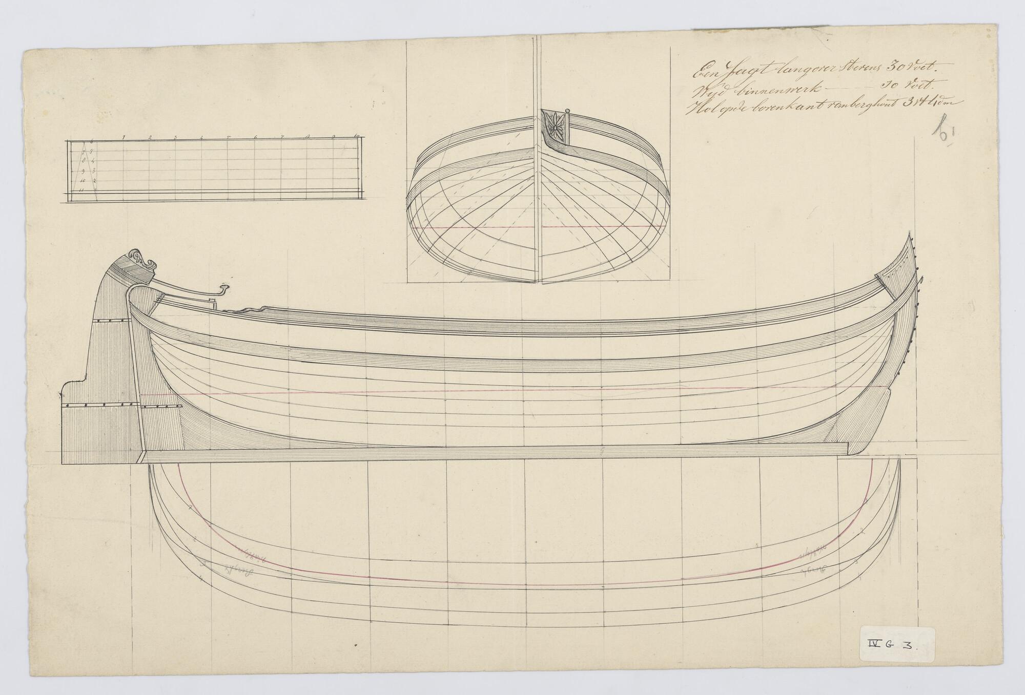 Vooraanzicht, achteraanzicht, zijaanzicht, senten van een boeier. Afmetingen 30.0 x 10 x 3.4 voet.