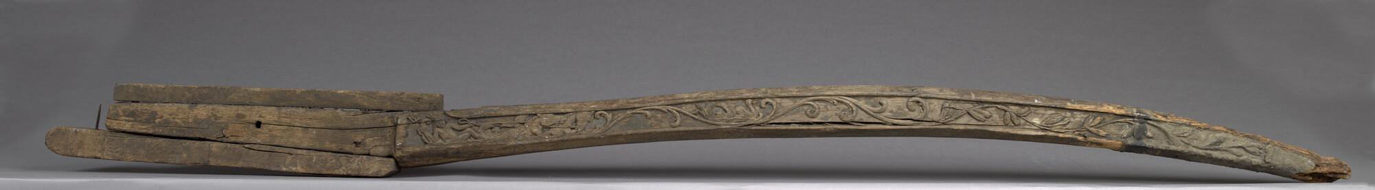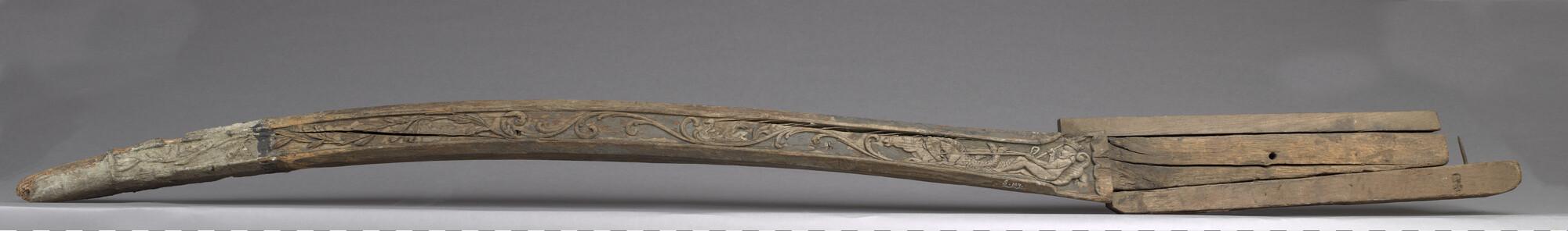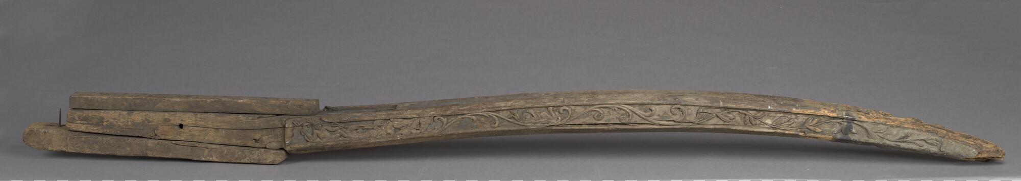 Helmstok van bewerkt hout, vierkant in doorsnede, afkomstig van een binnenvaartschip. Aan weerskanten van de helmstok bevindt zich een vrijwel identieke decoratie. De versiering bevat verder voluten die als golven zijn weergegeven. De voluten lopen door tot aan het voorste gedeelte van de helmstok en gaan daar over in lofwerk. De bovenzijde van de helmstok ...