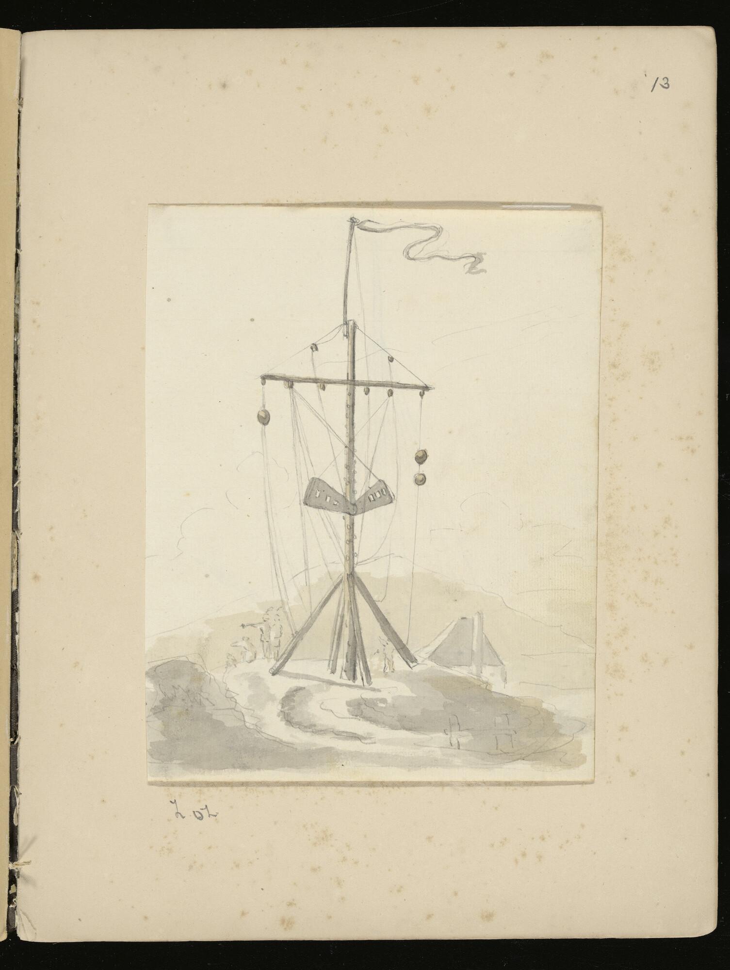 Een Bataafse kusttelegraaf anno 1799 met seinhuisje (verso: een boeier.).