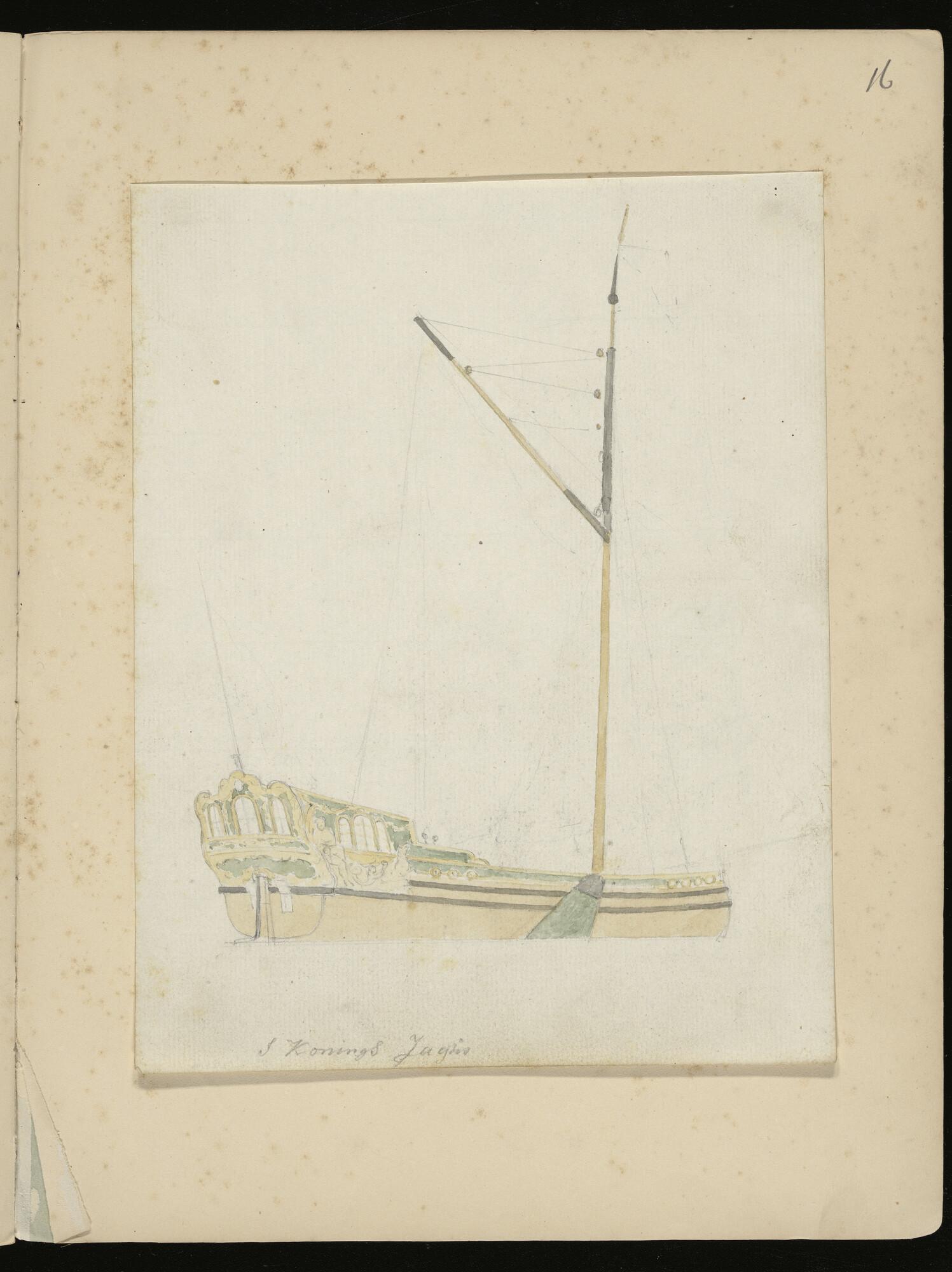 Tekening van een spiegelpaviljoenjacht (verso: een krabbel).