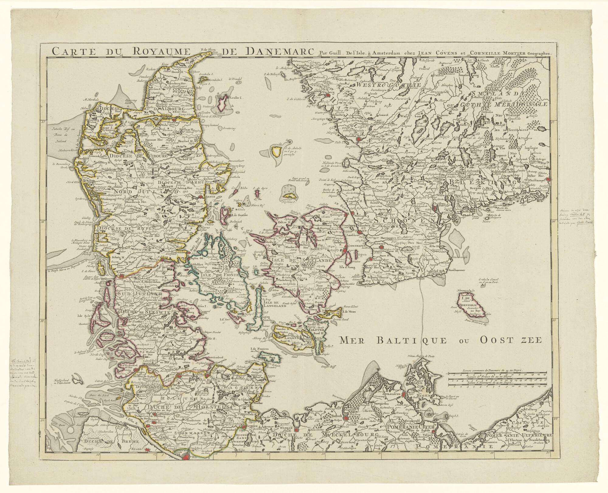 Met de hand gekleurde kaart naar Guillaume De l'Isle (1675-1726), van het koninkrijk Denemarken. Uitgave Jan Covens en Cornelis Mortier, Amsterdam, circa 1730. Lengte t.o.v. de meridiaan van Teneriffe (schaal 1 op 1000.000).