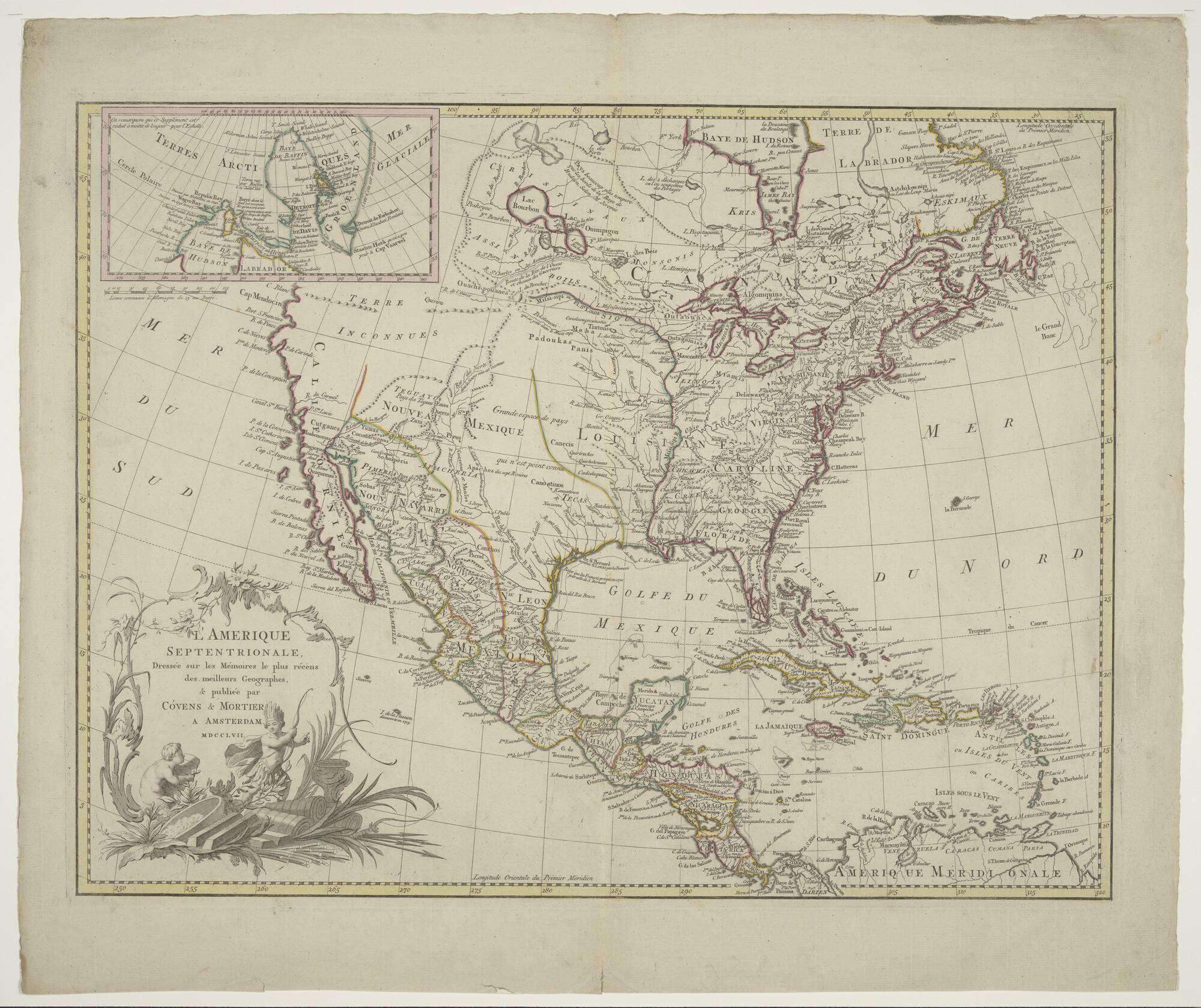 Met de hand gekleurde kaart van Noord-Amerika. Uitgave Jan Covens en Cornelis Mortier, Amsterdam, 1757. Inzetkaartje van de Amerikaanse Arctis (schaal 1 op 14.000.000).