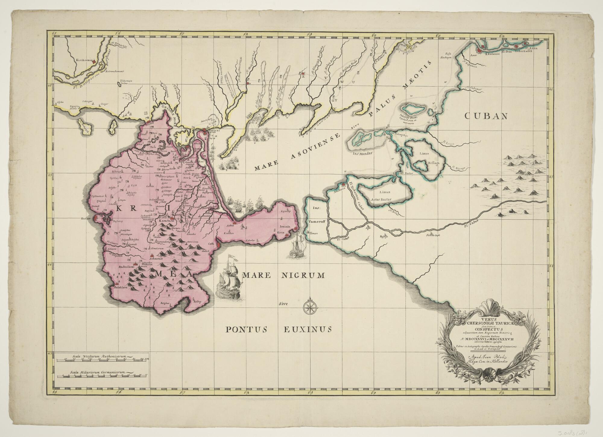 Met de hand gekleurde kaart van de Krim in Rusland door Carl von Frauendorff van St Petersburg. Uitgave Joan Block, Den Haag, circa 1737 (schaal 1 op 900.000).