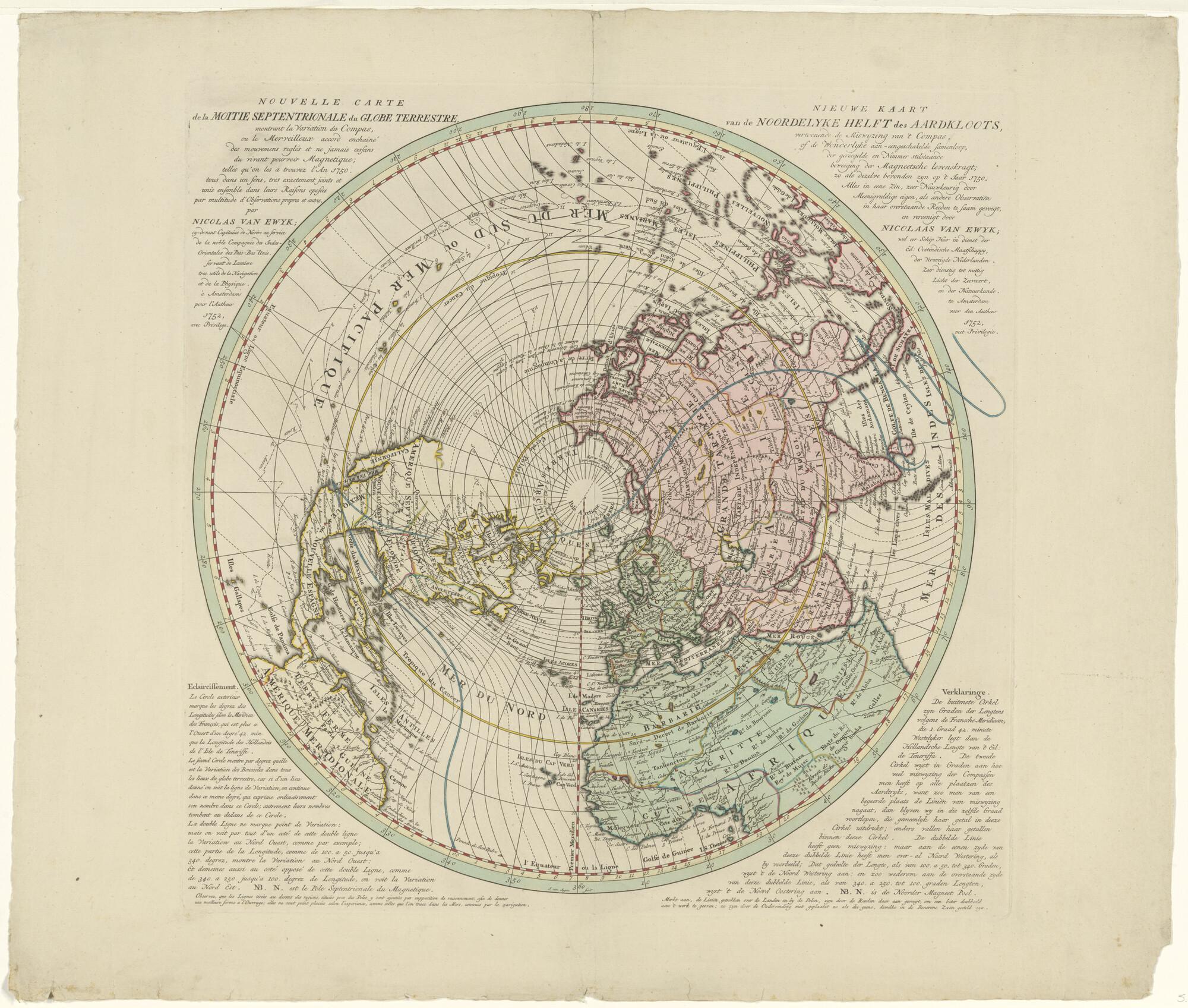Wereldkaart naar Guillaume De L'Isle (1675 - 1726) samengesteld door de VOC-kapitein Nicolaas van Ewyk waarin de variatie aangegeven zoals in 1750 waargenomen.
