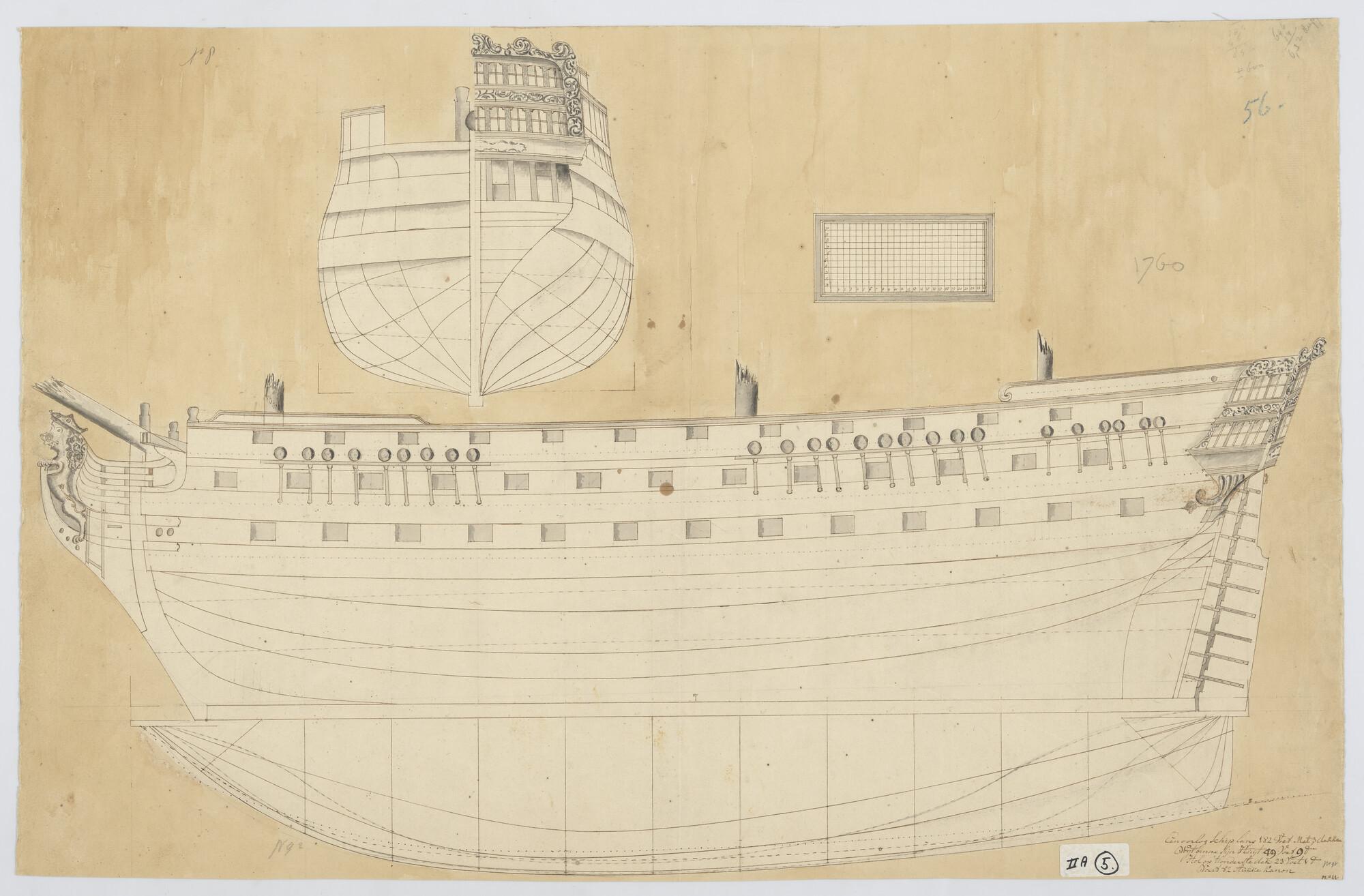 Lijnenplan met zijaanzicht, achteraanzicht, spantenraam, waterlijnen van een driedeks oorlogsschip van 82 stukken. De afmetingen van het schip zijn 182 x 49.9 x 23.1 voet.
