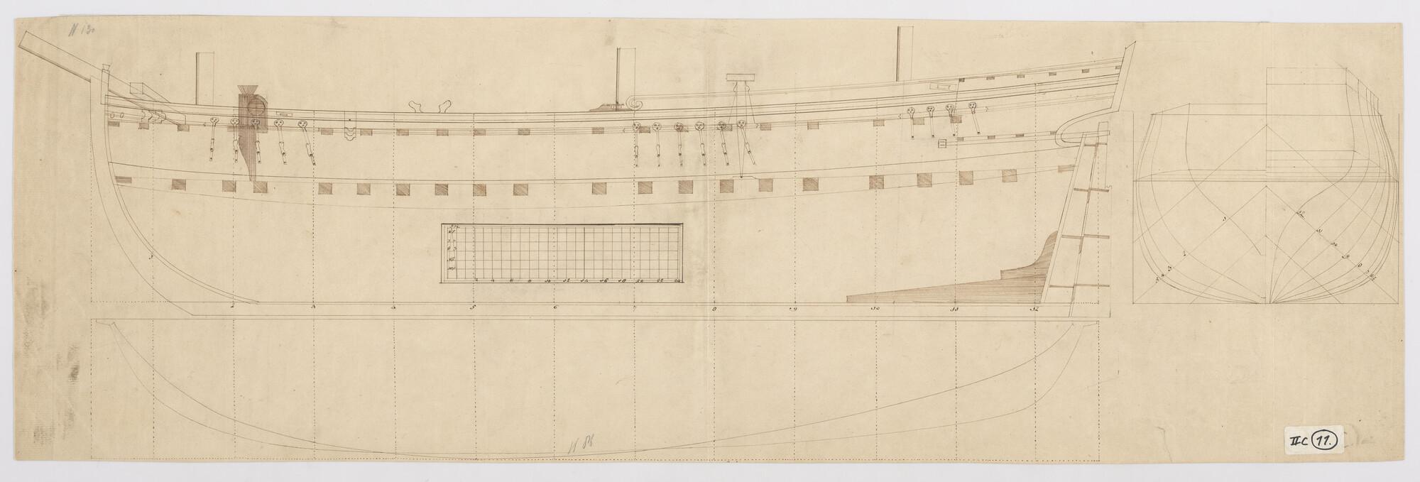 Zijaanzicht, opengewerkt zijaanzicht, spantenraam en senten van een pinkschip.