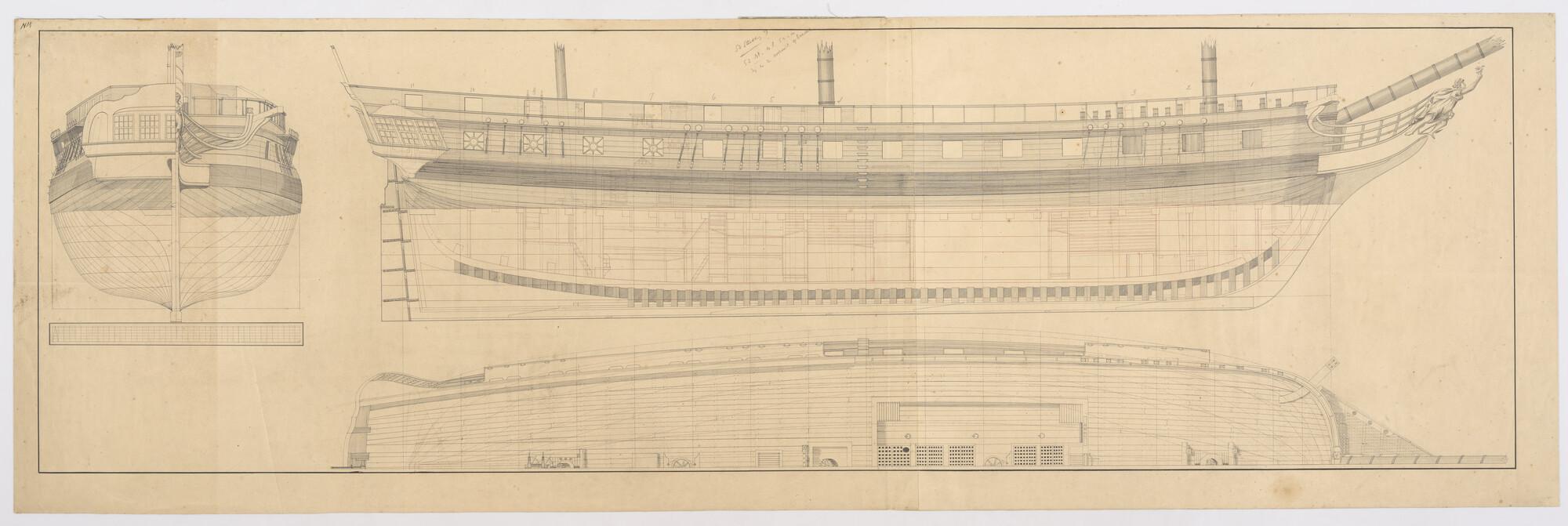 Zijaanzicht, verticale langsdoorsnede, vooraanzicht, achteraanzicht, bovenaanzicht, spantenraam, senten, waterlijnen en schegversiering van een Frans fregat van 52 stukken.