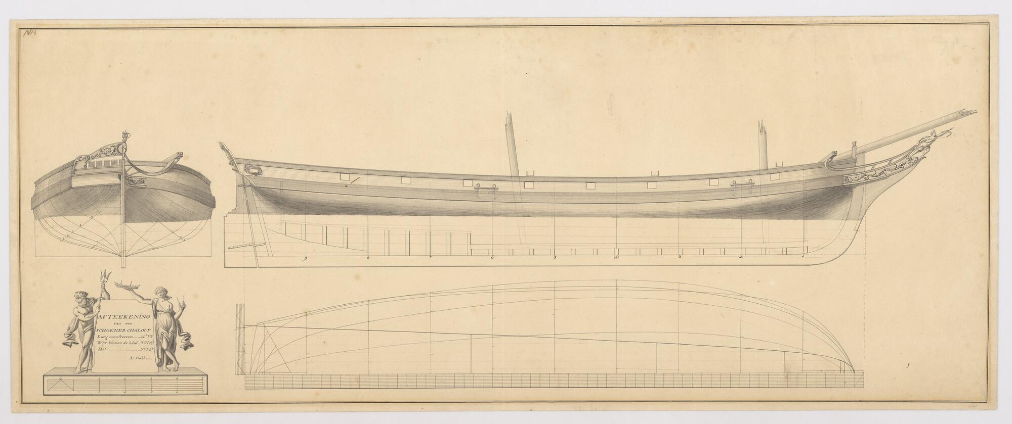 Zijaanzicht, vooraanzicht, achteraanzicht, spantenraam, waterlijnen, senten van een schoenersloep. Het schegbeeld bestaat uit een vrouw een pijl afschietend. Afmetingen van het schip 26 x 7.2½ x 3.2 voet.