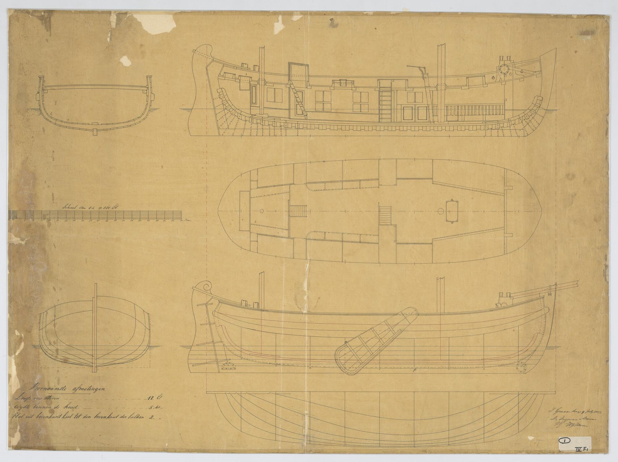 Loodsrinkelaar. Verticale langsdoorsnede, zijaanzicht, vooraanzicht, achteraanzicht, waterlijnen, grootspant, Indeling benedendeks. Loodsrinkelaar 1853. Afmetingen 17 x 5.4 x 2 el.