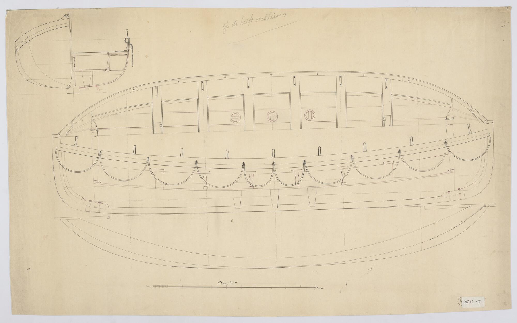 Zijaanzicht, bovenaanzicht, vooraanzicht, dwarsdoorsnede, grootspant en waterlijnen van een Strandreddingsboot., circa 1870.