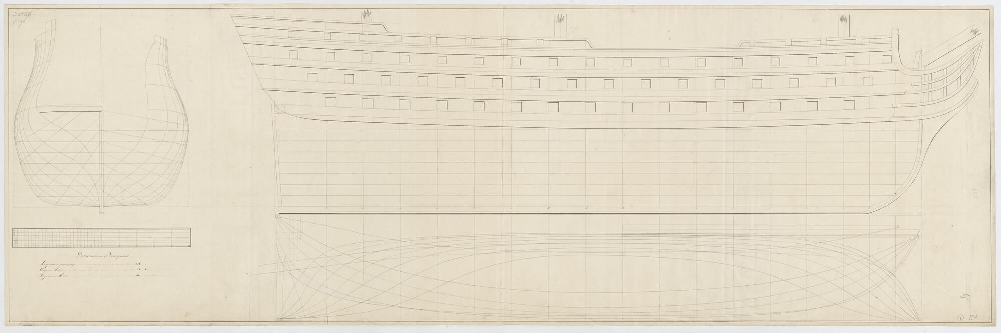 Lijnenplan met spantenraam, zijaanzicht, waterlijnen van een linieschip van 120 stukken. Afmetingen van het schip zijn 181 x 50 x 24 1/2 voet.
