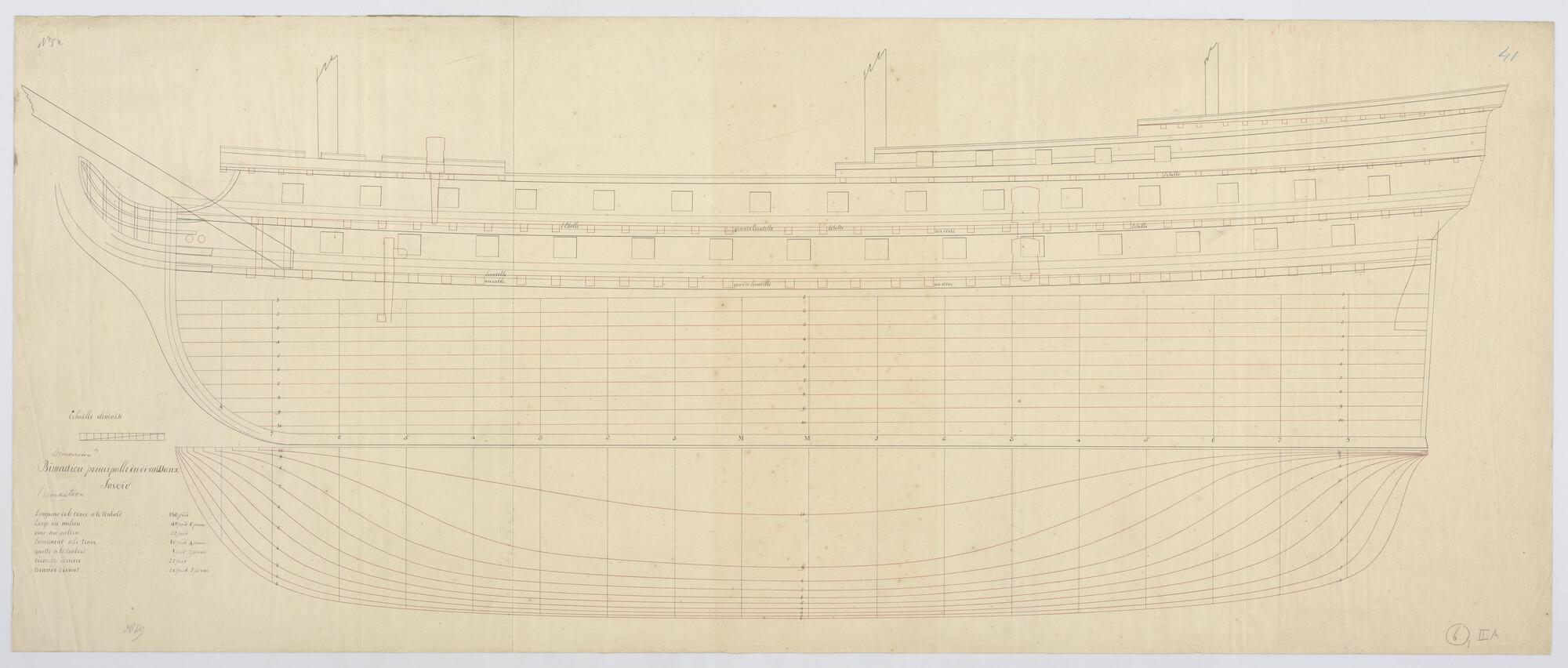 Lijnenplan met zijaanzicht, waterlijnen van een Frans tweedeks oorlogsschip van 74 stukken. Afmetingen van het schip 180 x 48 x 22 voet.