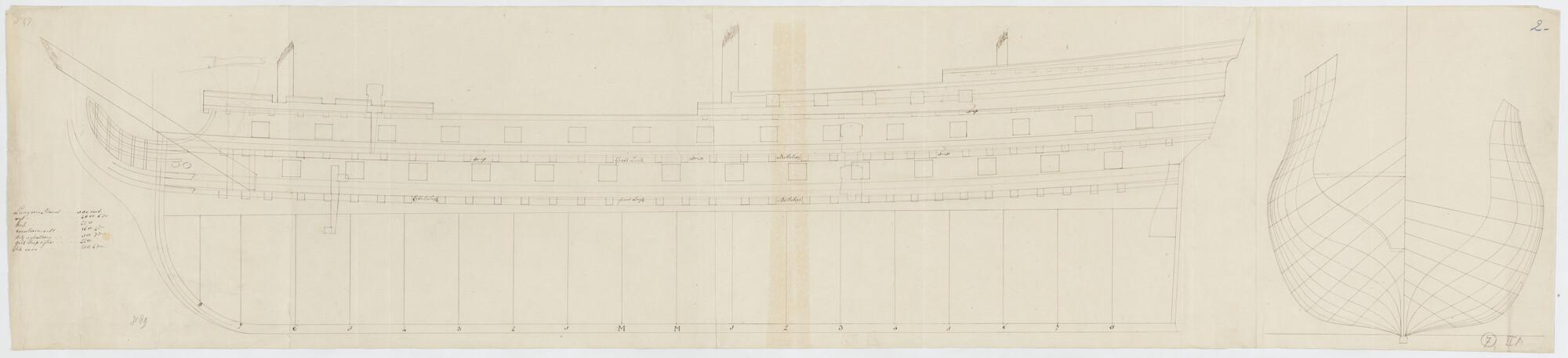 Lijnenplan met zijaanzicht, spantenraam van een Frans tweedeks oorlogsschip van 74 stukken.