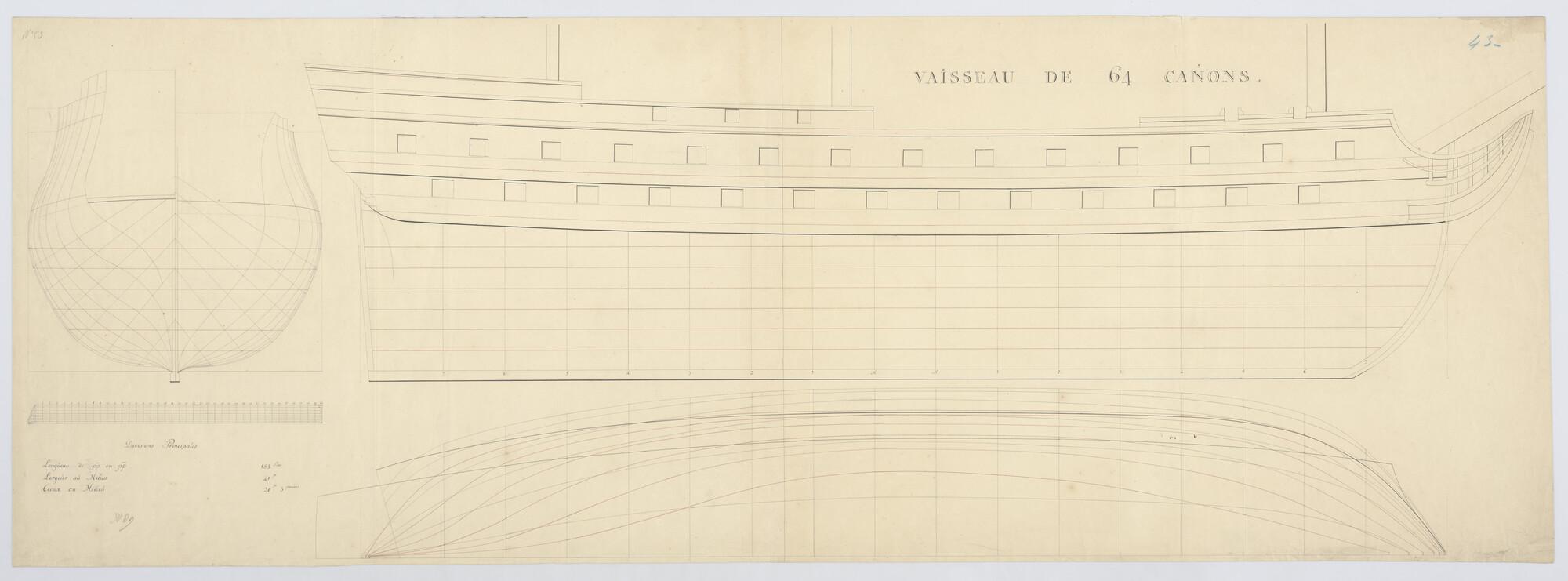 Lijnenplan met zijaanzicht, spantenraam, waterlijnen, senten van een Frans schip van 64 stukken. Afmetingen van het schip 153 x 41 x 20.3 voet.
