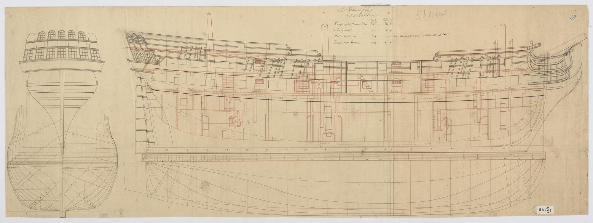 Lijnenplan met zijaanzicht, verticale langsdoorsnede, achteraanzicht, spantenraam, waterlijnen, senten, twee geschutsdekken van een schip van 54 stukken. Afmetingen van het schip 154,5 x 42,9½ x 17,5 voet.