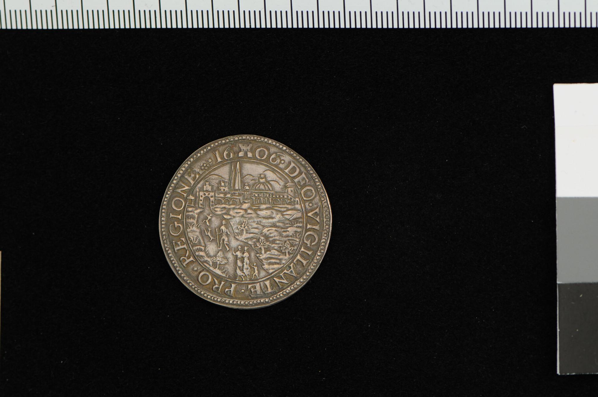 Rekenpenning, geslagen op last van de Staten van Zeeland, op de Goddelijke bijstand aan de opstandelingen, 1606.