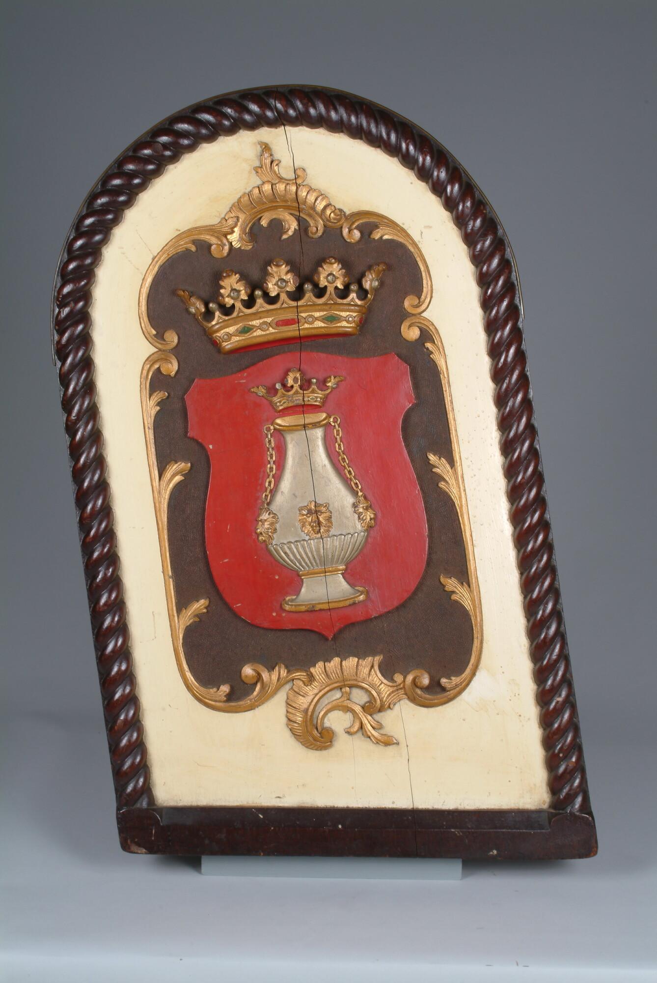 Langwerpig houten bord met halfronde bovenkant afgezet met een koperen band met midden op het bord in een cartouche het stadswapen van Vlissingen, omgeven door een uitgesneden kabelrand.