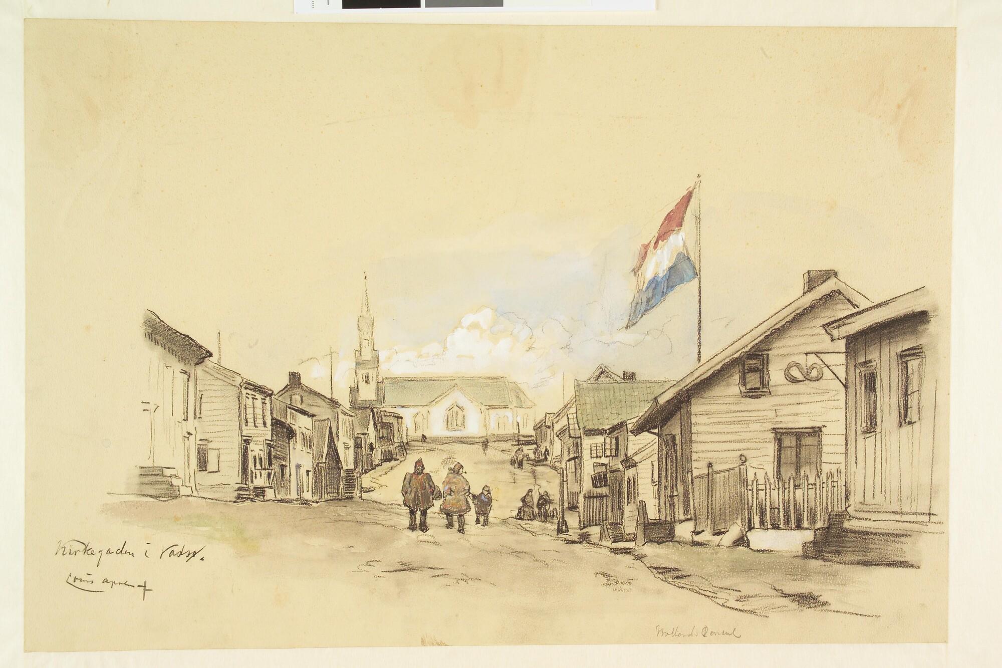 De "Kirkegaden" in Vadsö (Noorwegen), met het huis van de Nederlandse consul met Nederlandse vlag.