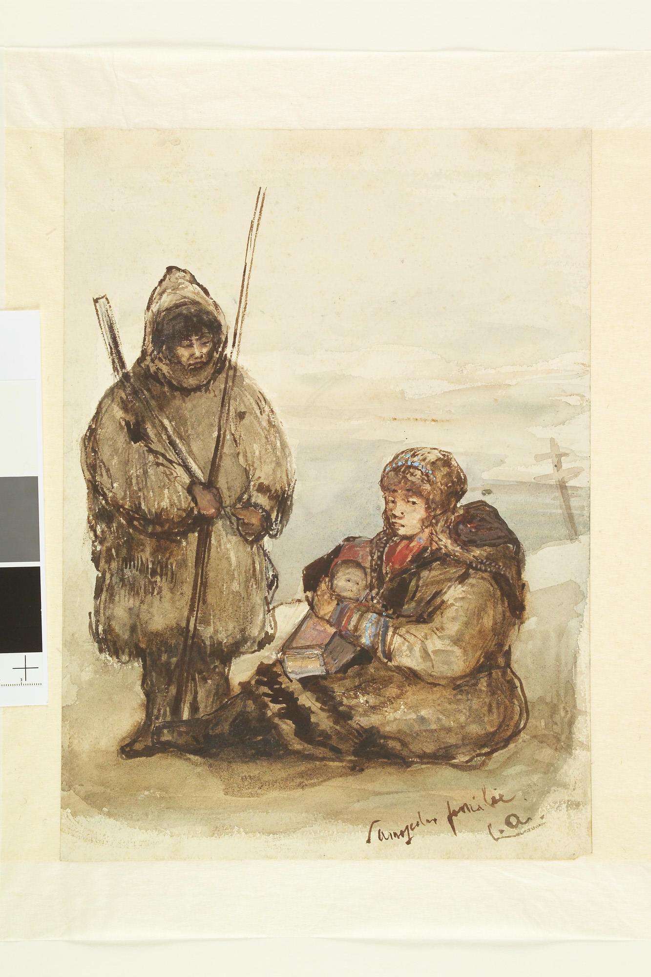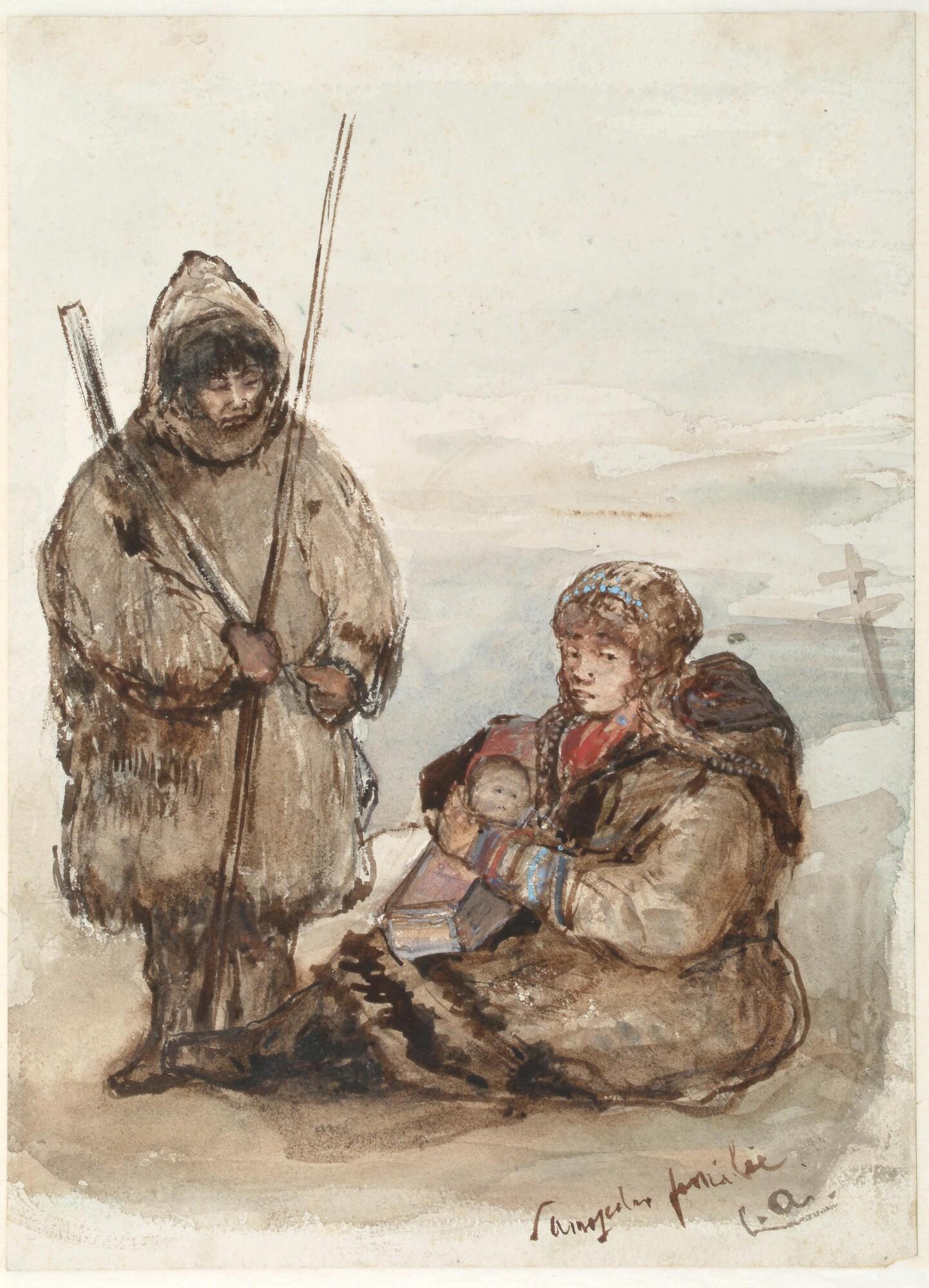 Een Samojedenfamilie: een staande man en rechts een zittende vrouw met een baby op schoot. De tekening is gemaakt op Nova Zembla bij het Russisch reddingstation in de Kruisbaai in de zomer van 1880.