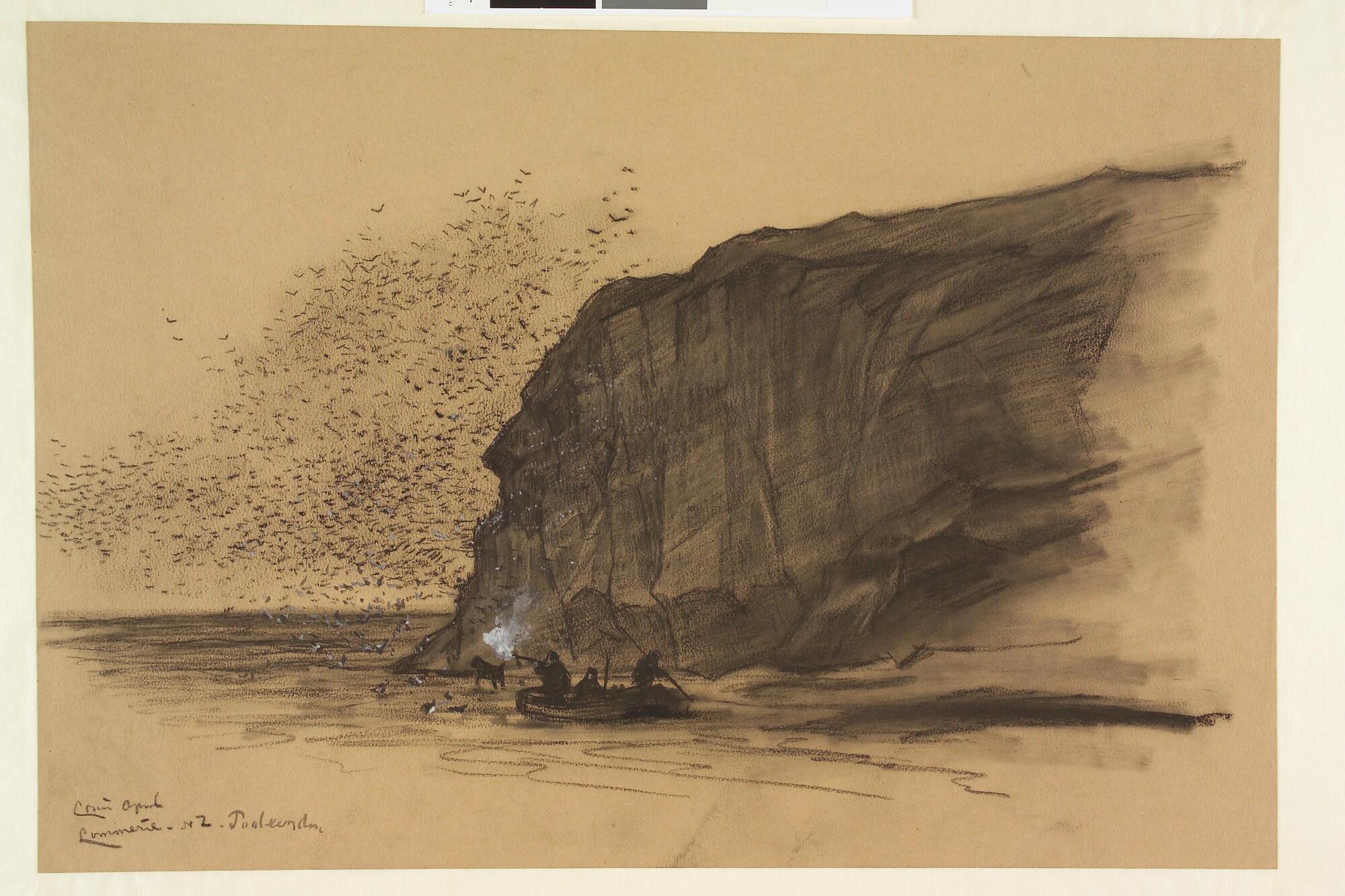 Jacht op pooleenden, Nova Zembla. Jacht op pooleenden, Nova Zembla; eendenjagers met hond in een sloep bij een hoge rots, en een zwerm vogels.