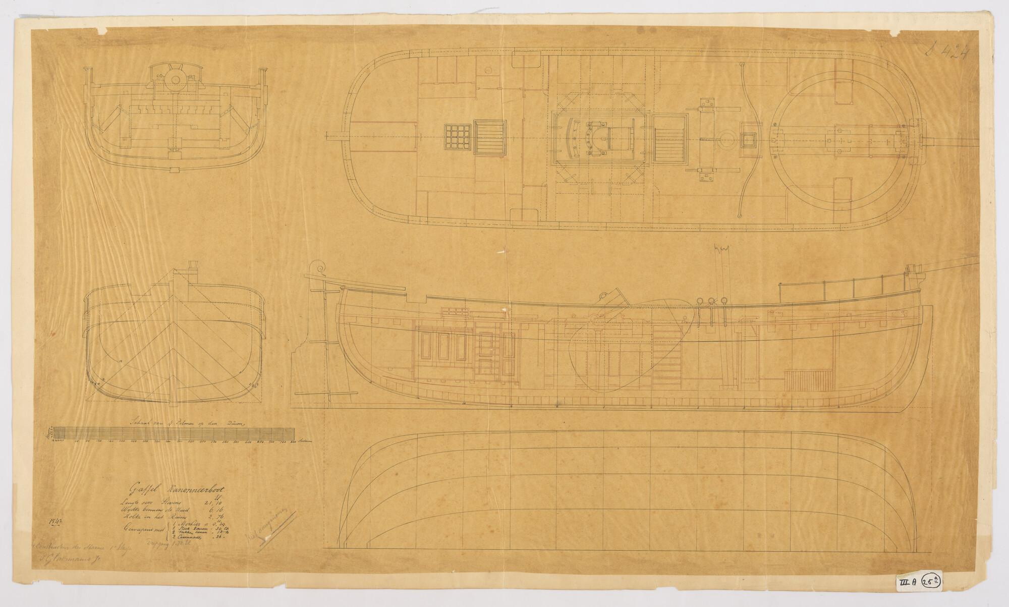 Langsdoorsnede, bovenaanzicht, grootspant, lijnen, senten en spantenraam van een Deens model gaffelkanonneerboot. Afmetingen van het schip 21.10 x 6.16 x 2.76 el.