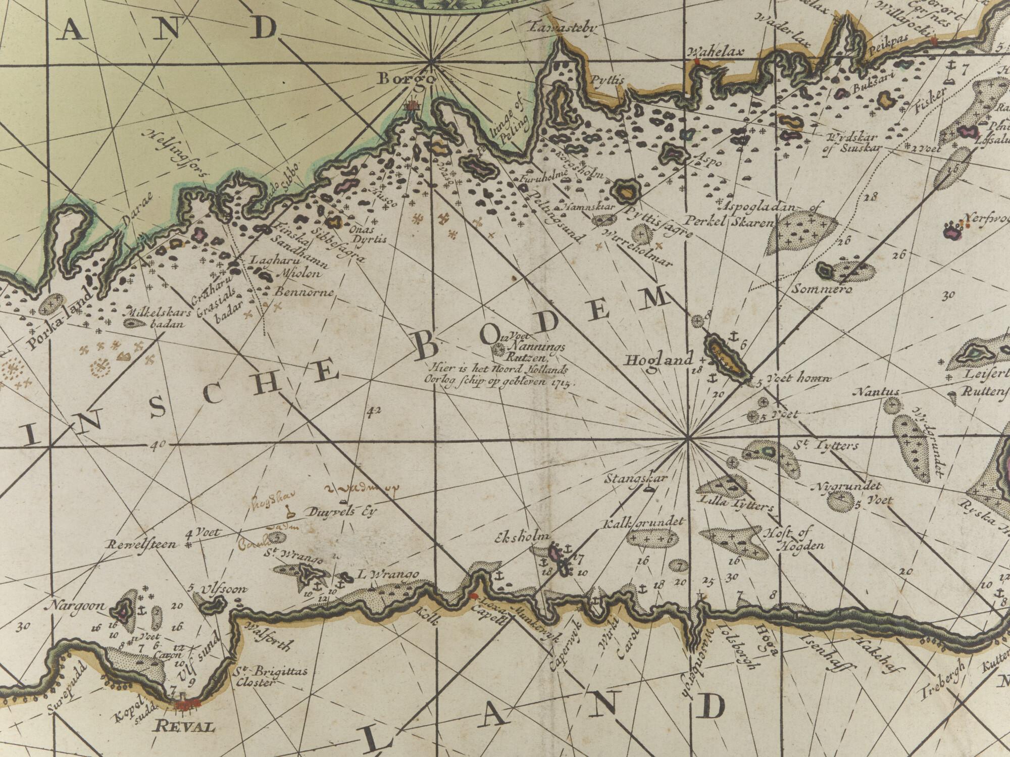 Met de hand gekleurde zeekaart van een deel van de Oostzee, van Windaw tot St Petersburg, samengesteld door Christoffel Middagten (1659-1723)