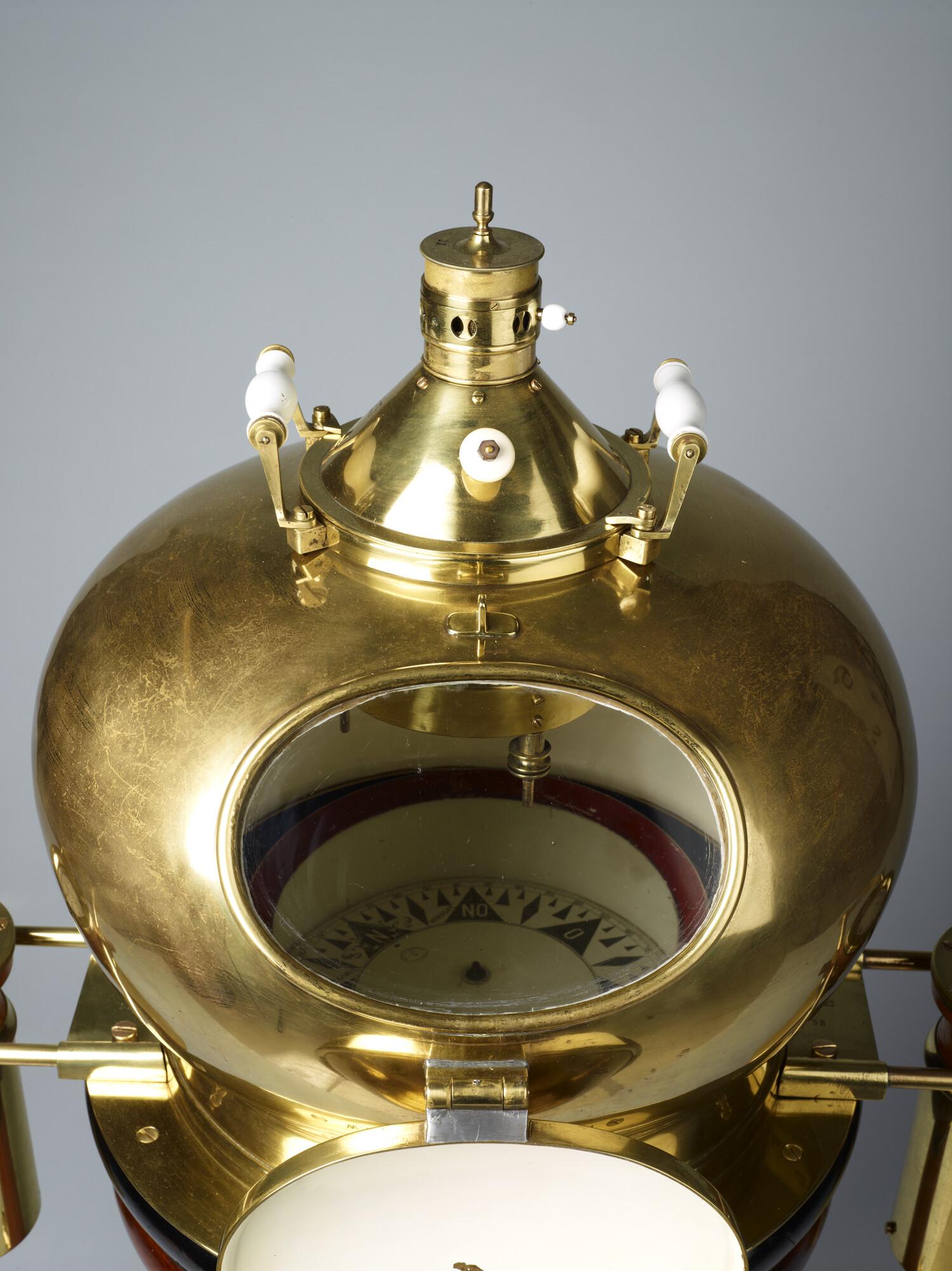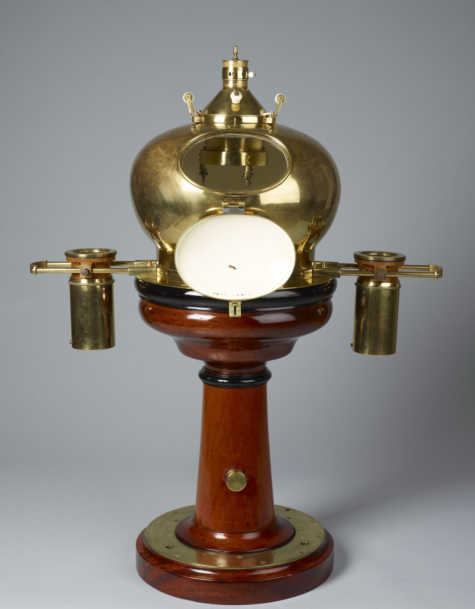Stuurkompas door Firma W. Boosman, Amsterdam, circa 1897 volgens een ontwerp van dr. P.J. Kaiser. Op voet met vloeistofkompas-compensatie ter weerszijden en kaarsverlichting in de kap. Afkomstig van pantserdekschip Hr.Ms. 'Zeeland'. Roos op ½ streek nauwkeurig, graadverd. 0-360 op 1°.