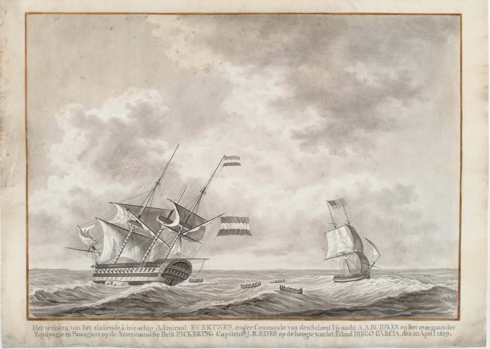 De redding van de bemanning van linieschip Zr.Ms. "Admiraal Evertsen" door het Amerikaanse brikschip "Pickering" nabij het eiland Diego Garcia, 1819.